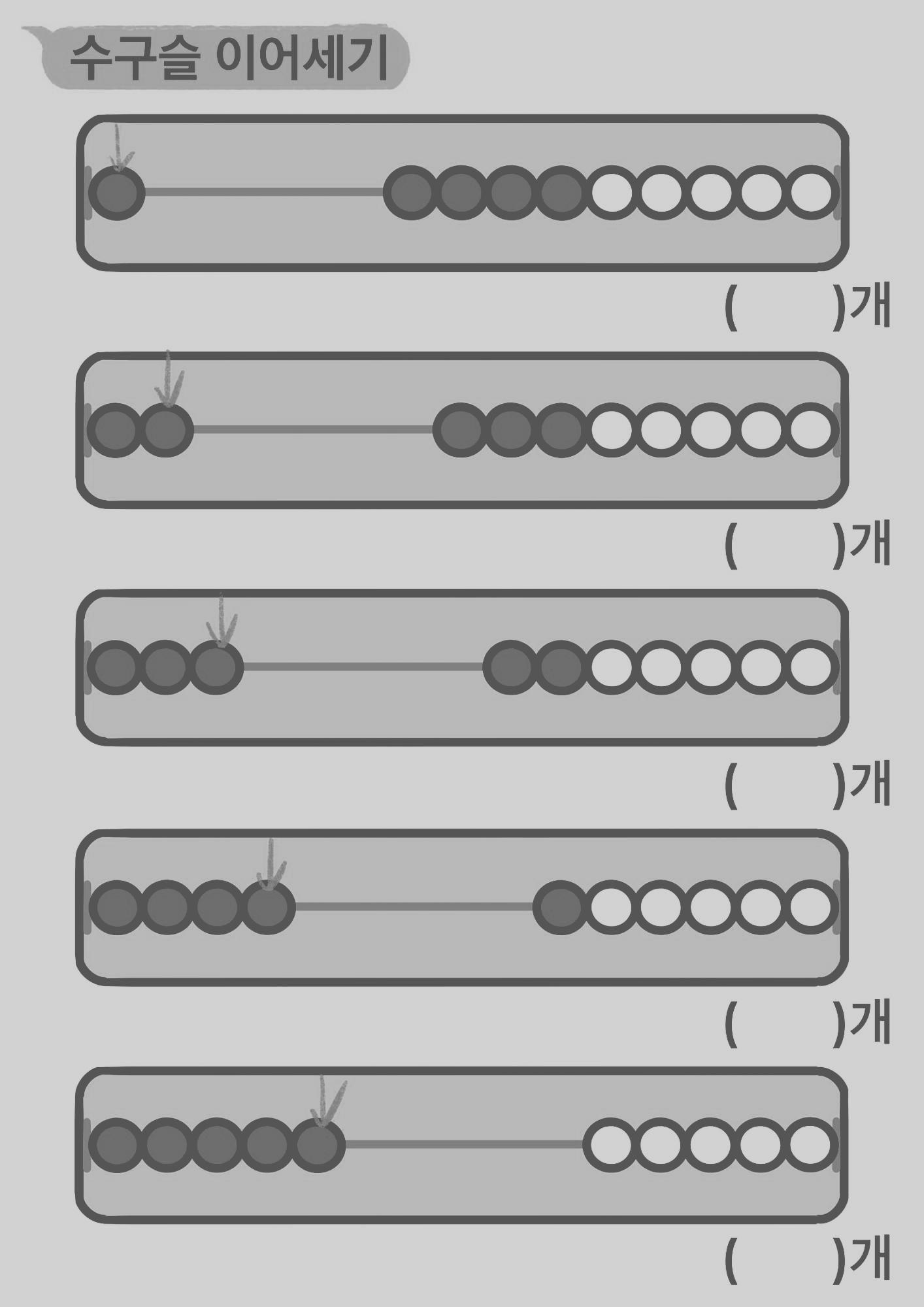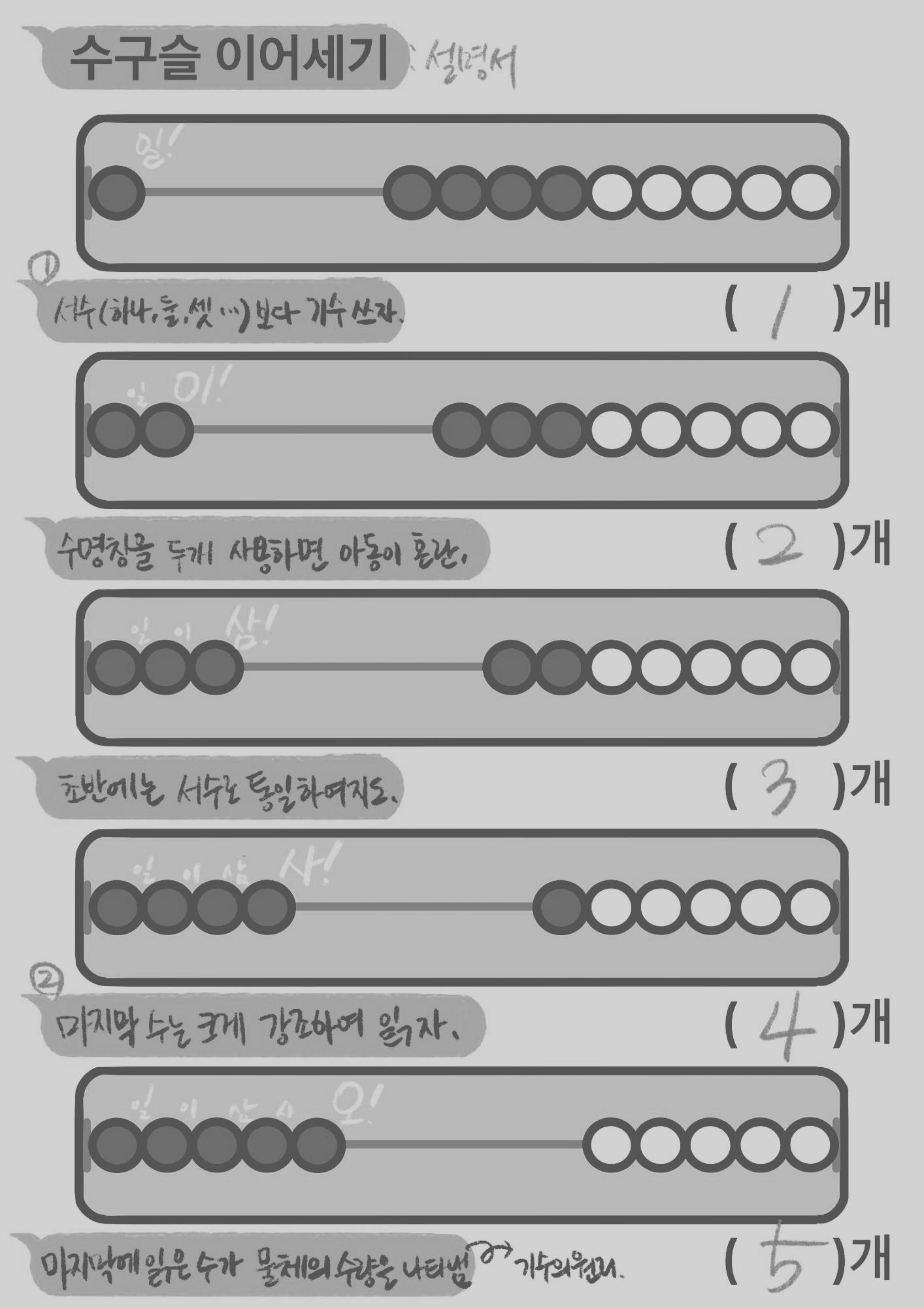 재구성한 구슬셈 활동지 기존의 활동을 작게 쪼개고, 문자는 적게, 그림은 크게 만들었다.