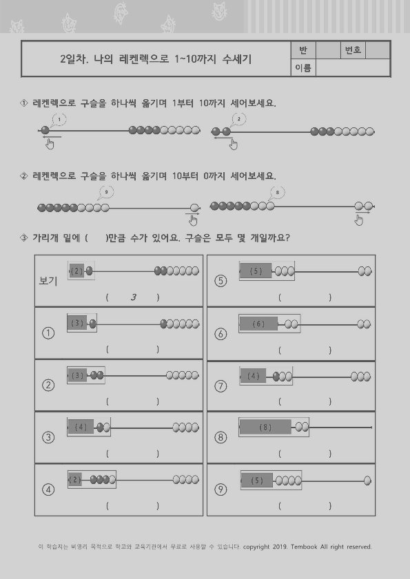 원래 2줄로 구성되있어 20까지 수세기가 가능한데, 우리반 아이는 10도 버거워 해서 한 줄로 변경하여 사용하였다.