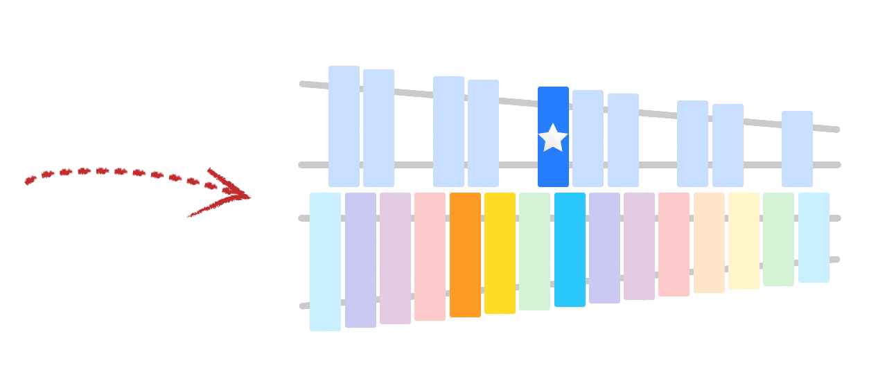 - 높은 음은 색깔막대가 높게, 낮은 음은 색깔 막대가 낮게 표시되어 있다.