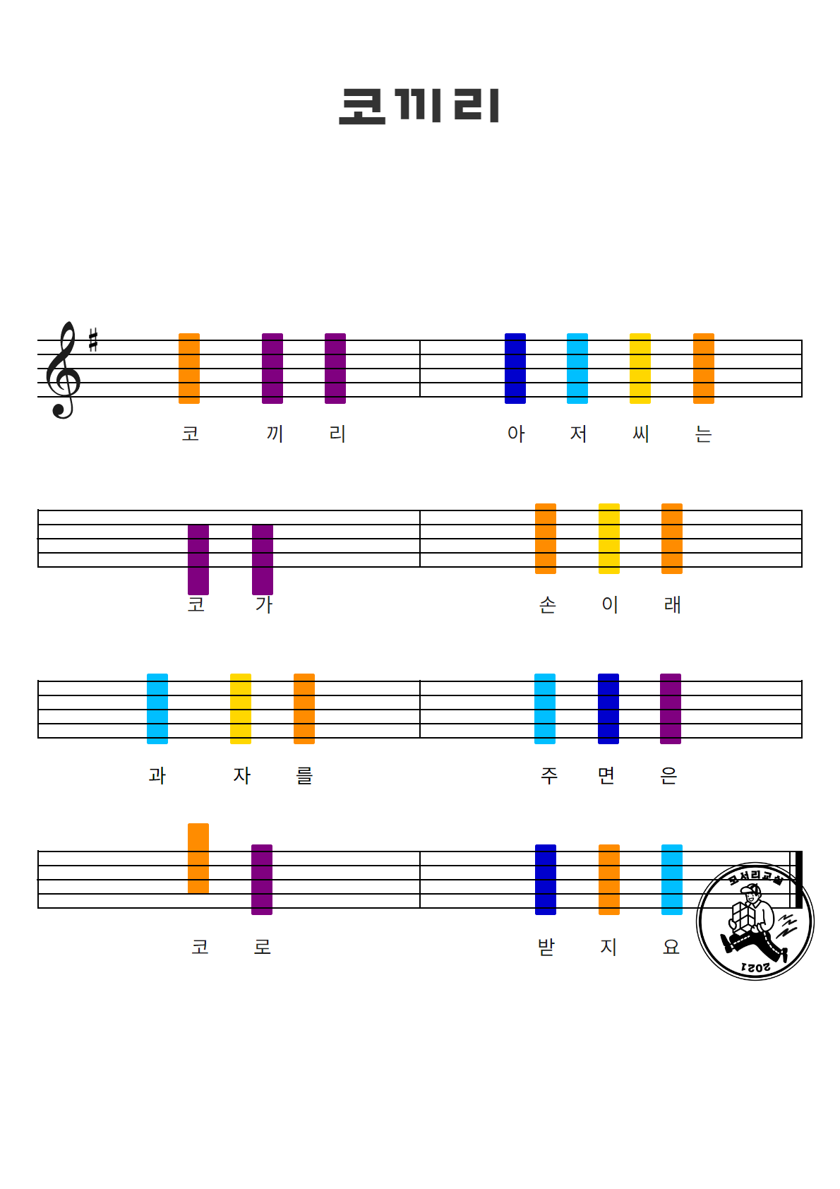 #125 실로폰:링딩동색깔악보(허수아비아저씨) (0) 2021.02.03 #121 실로폰:링딩동색깔악보(생일축하노래) (0) 2021.01.25 #116 실로폰:링딩동색깔악보(바나나알러지원숭이) (0) 2021.01.15 #114 실로폰:링딩동색깔악보(작은별) (0) 2021.01.13 #113 실로폰:링딩동색깔악보(상어가족)(활동소개) (2) 2021.01.12