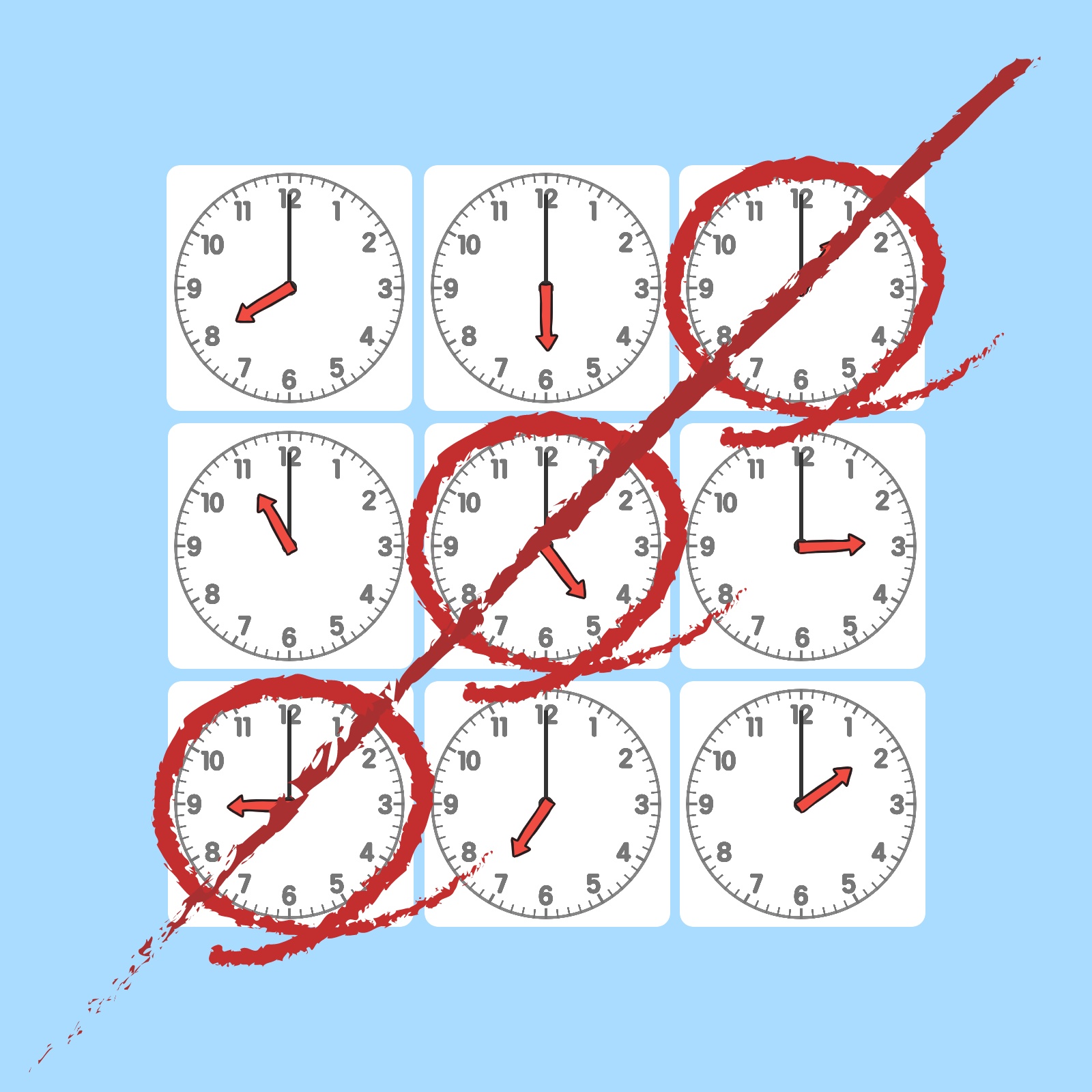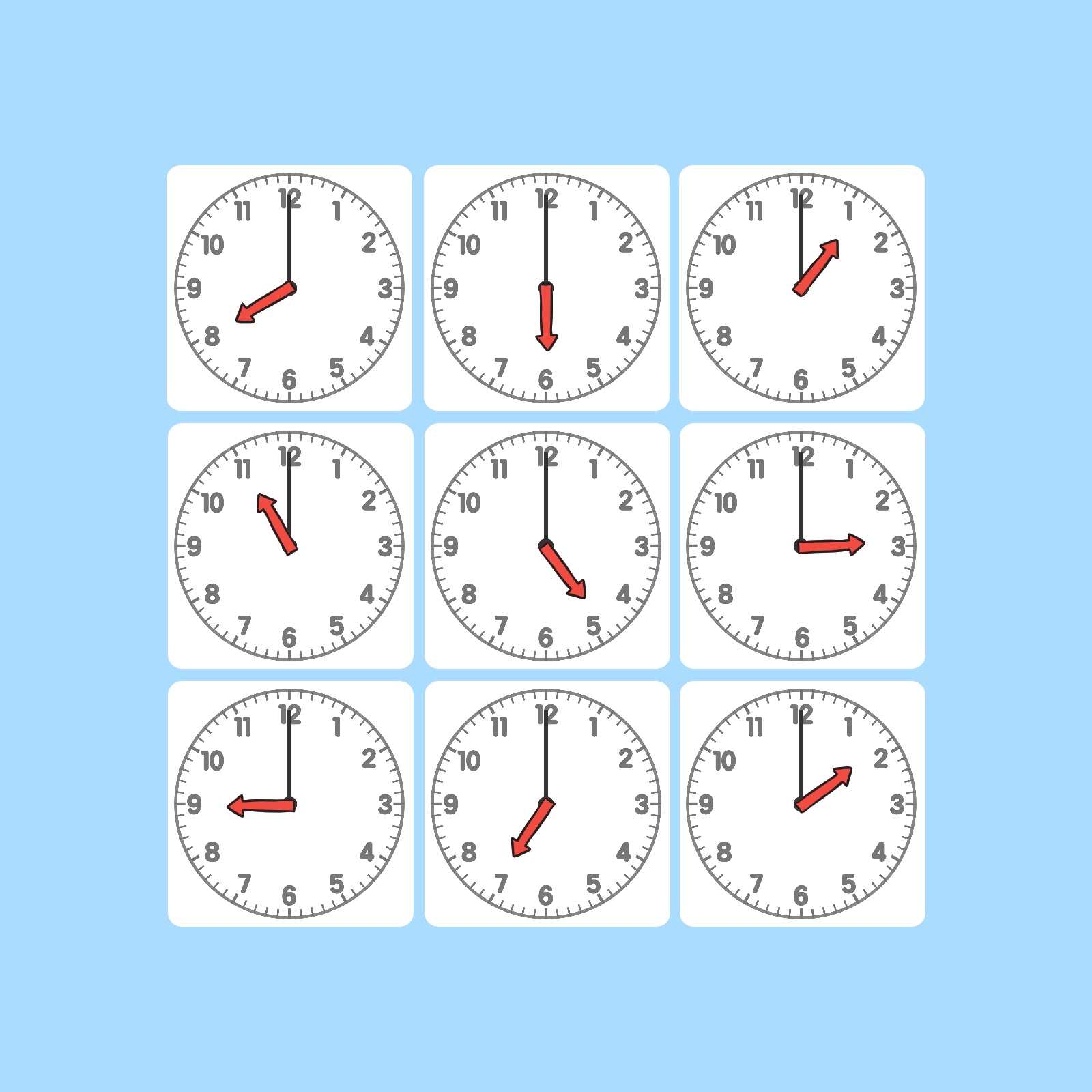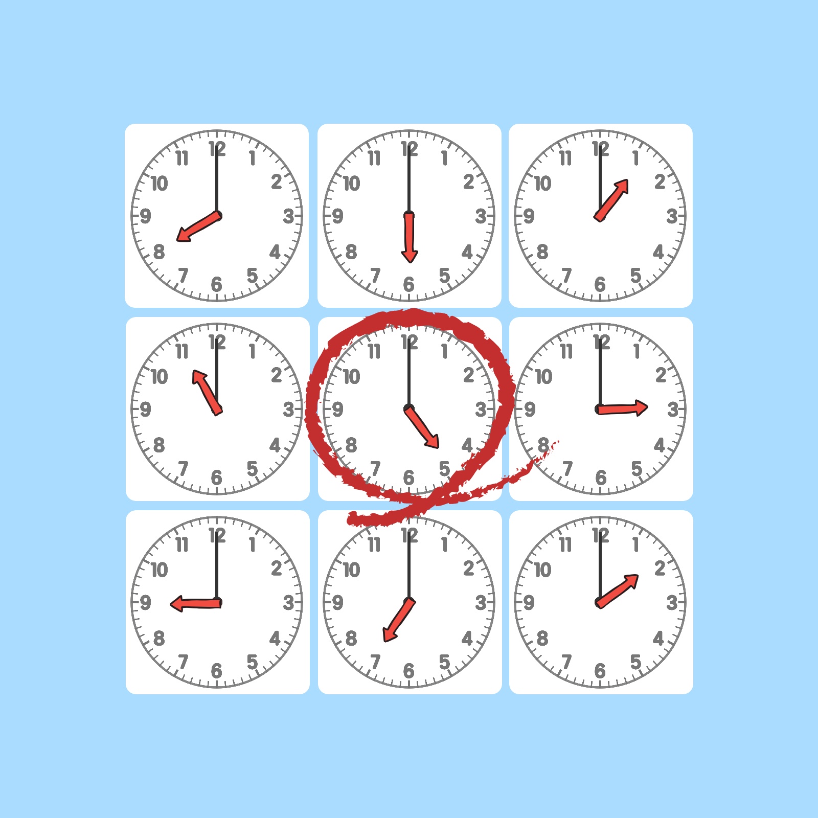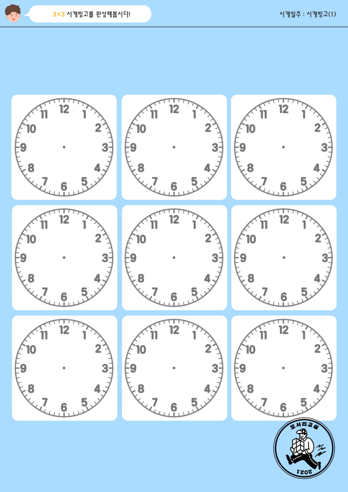 "한명씩 돌아가면서 빙고판에 있는 시계의 시각을 말해봅시다."