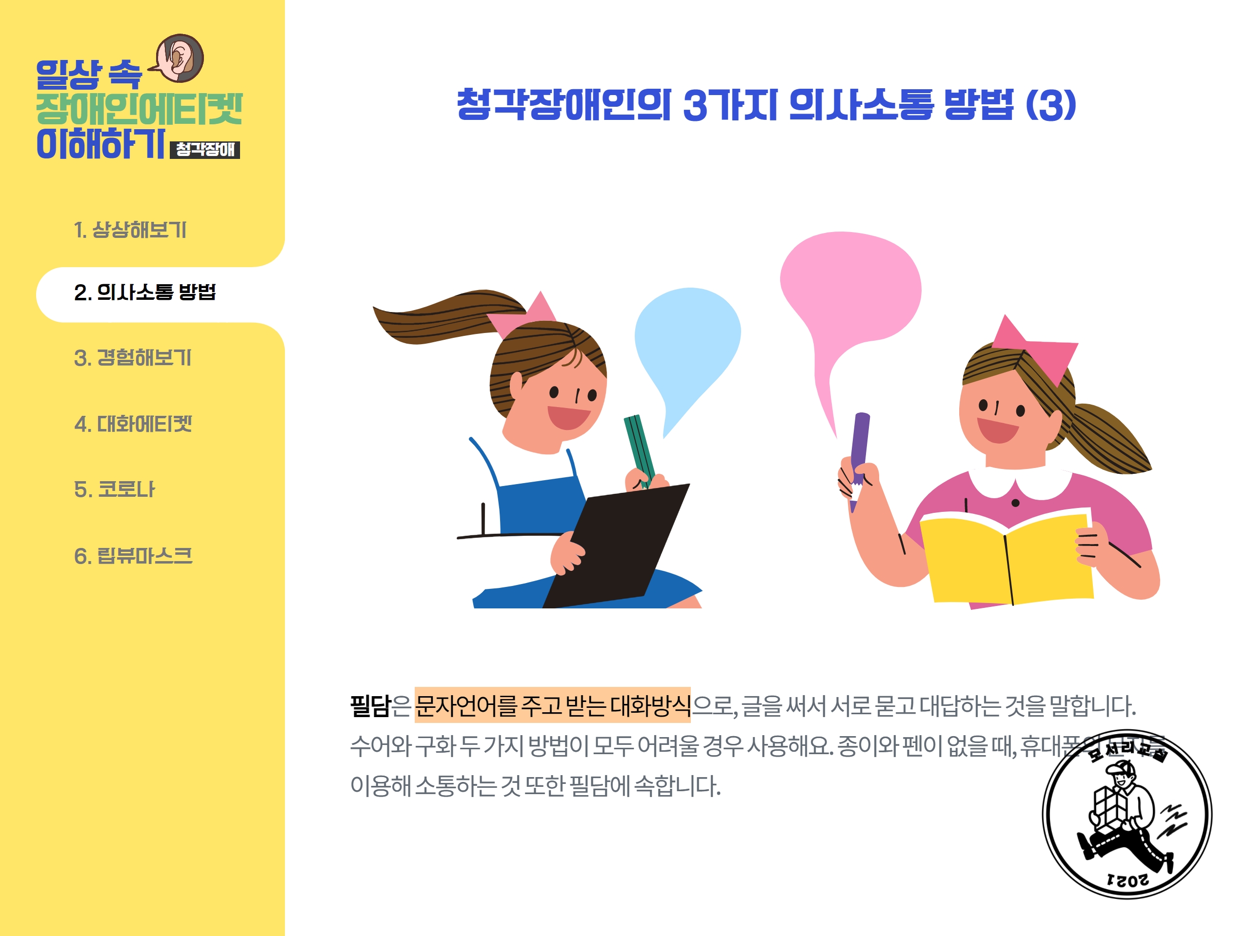"청각장애인과 대화할 수 있는 방법은 크게 세가지가 있습니다"