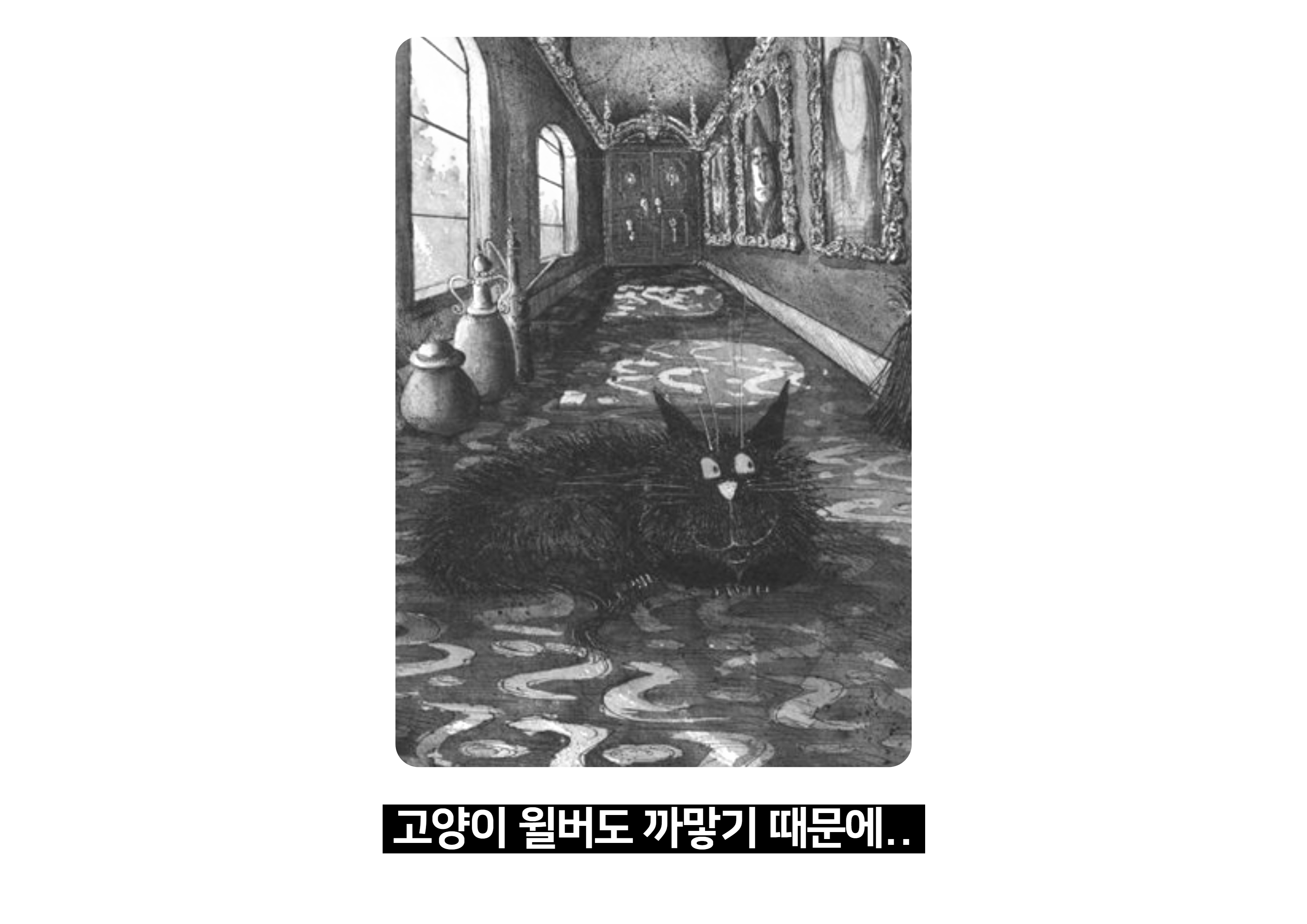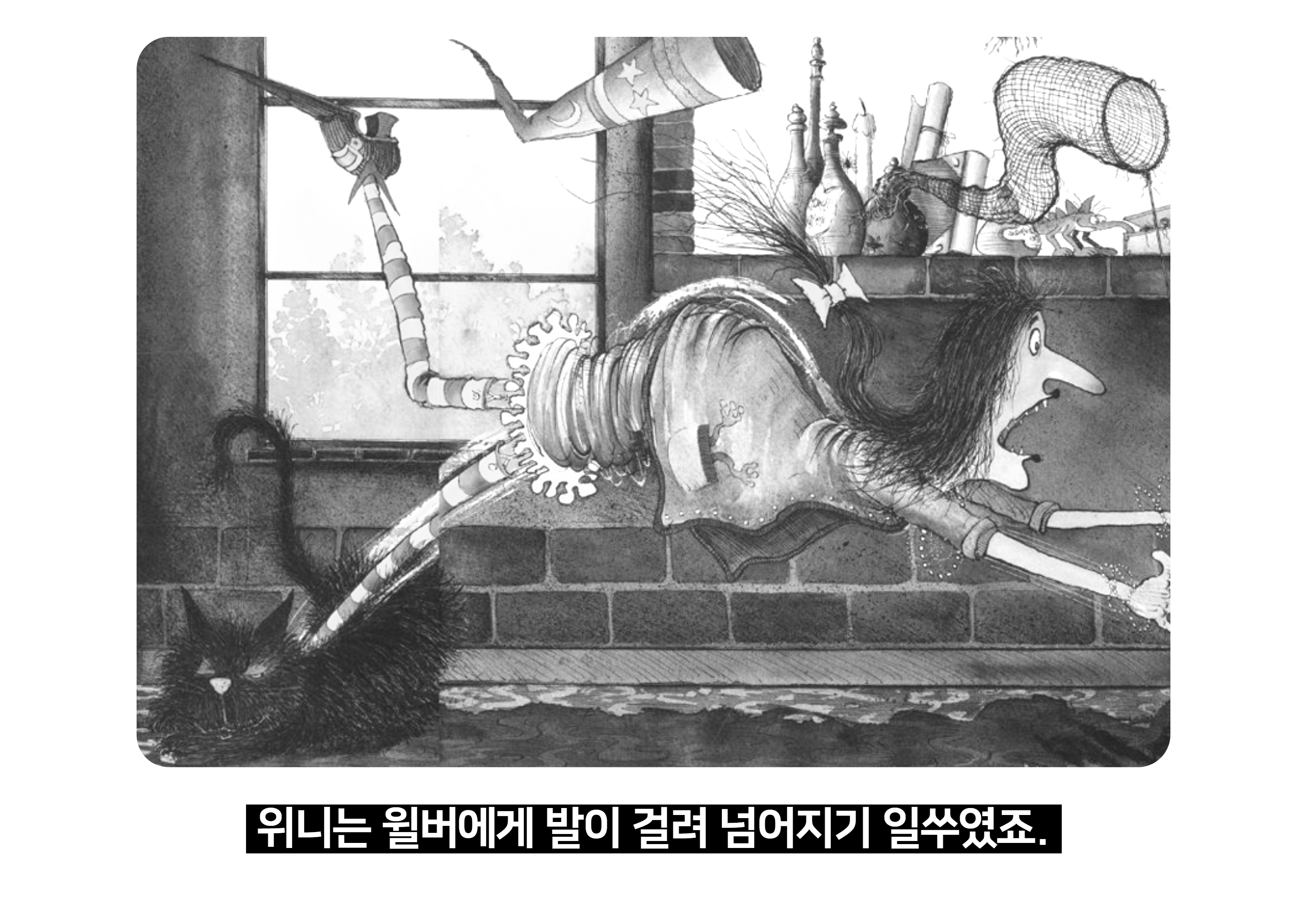 2. 그러자 검정 고양이 윌버를 알아볼 수 없어 위니는 고양이에 걸려 계속 넘어진다.