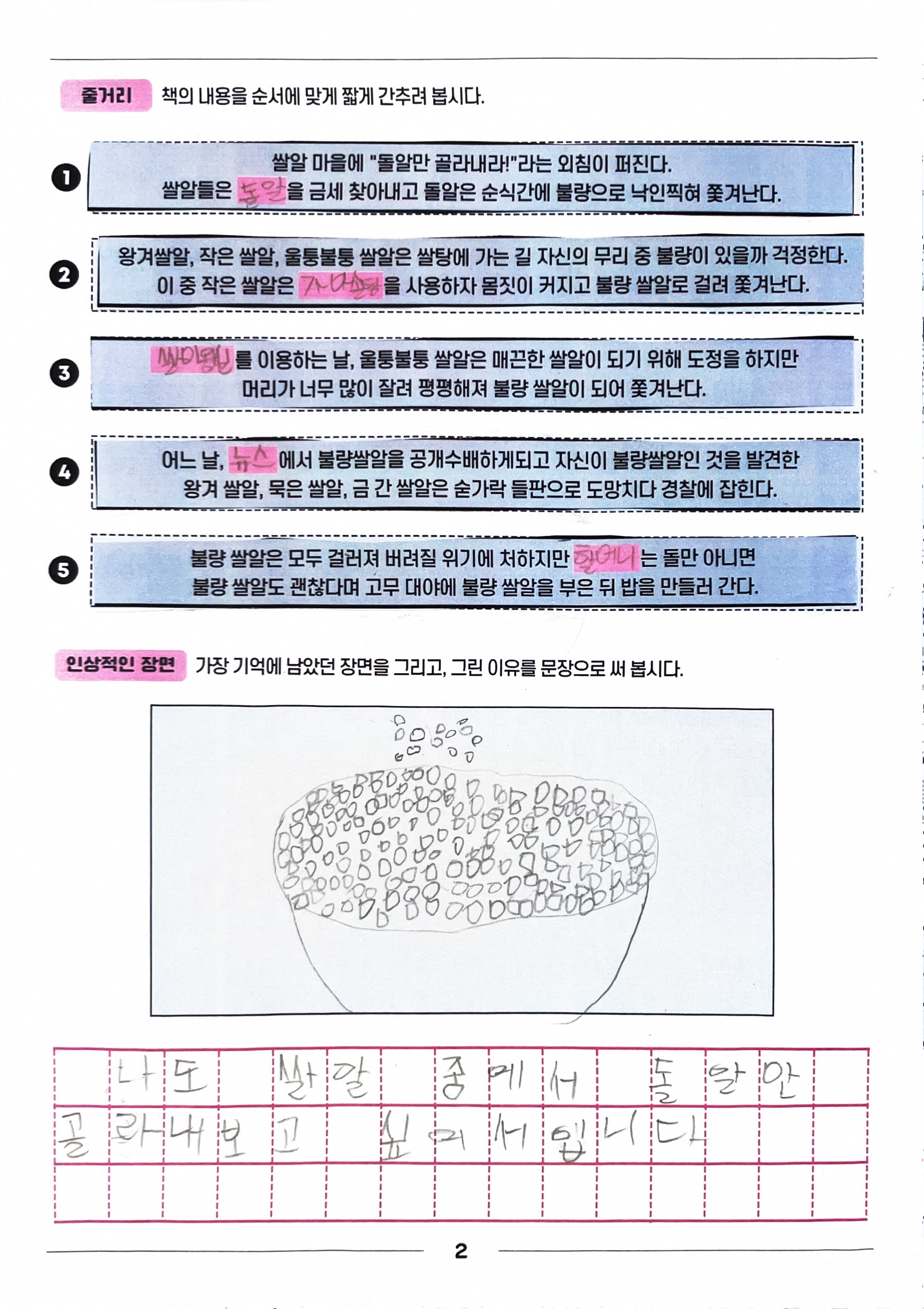 1. 어느 날, 쌀알 마을에 "돌알만 골라내라"는 외침이 퍼진다.