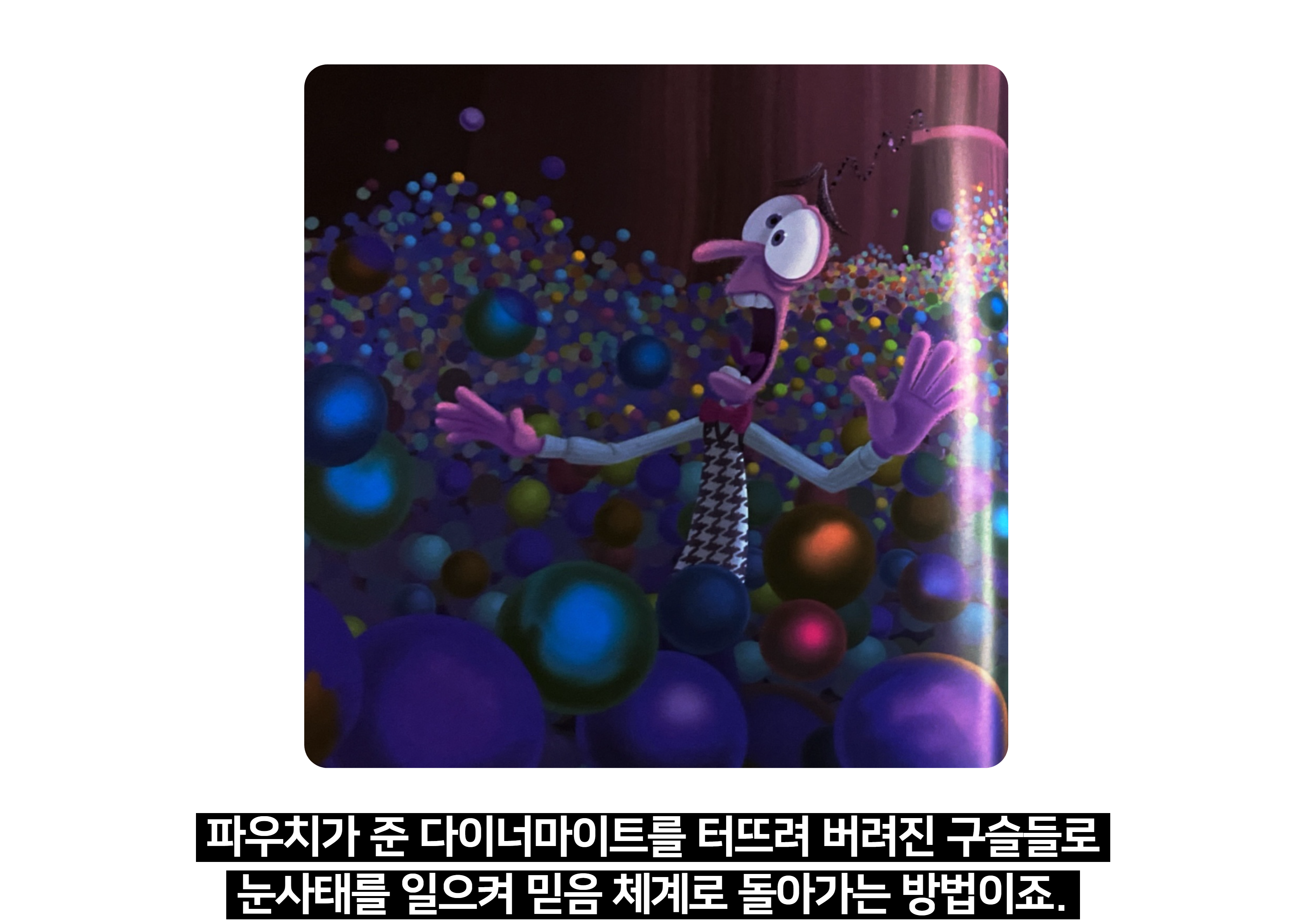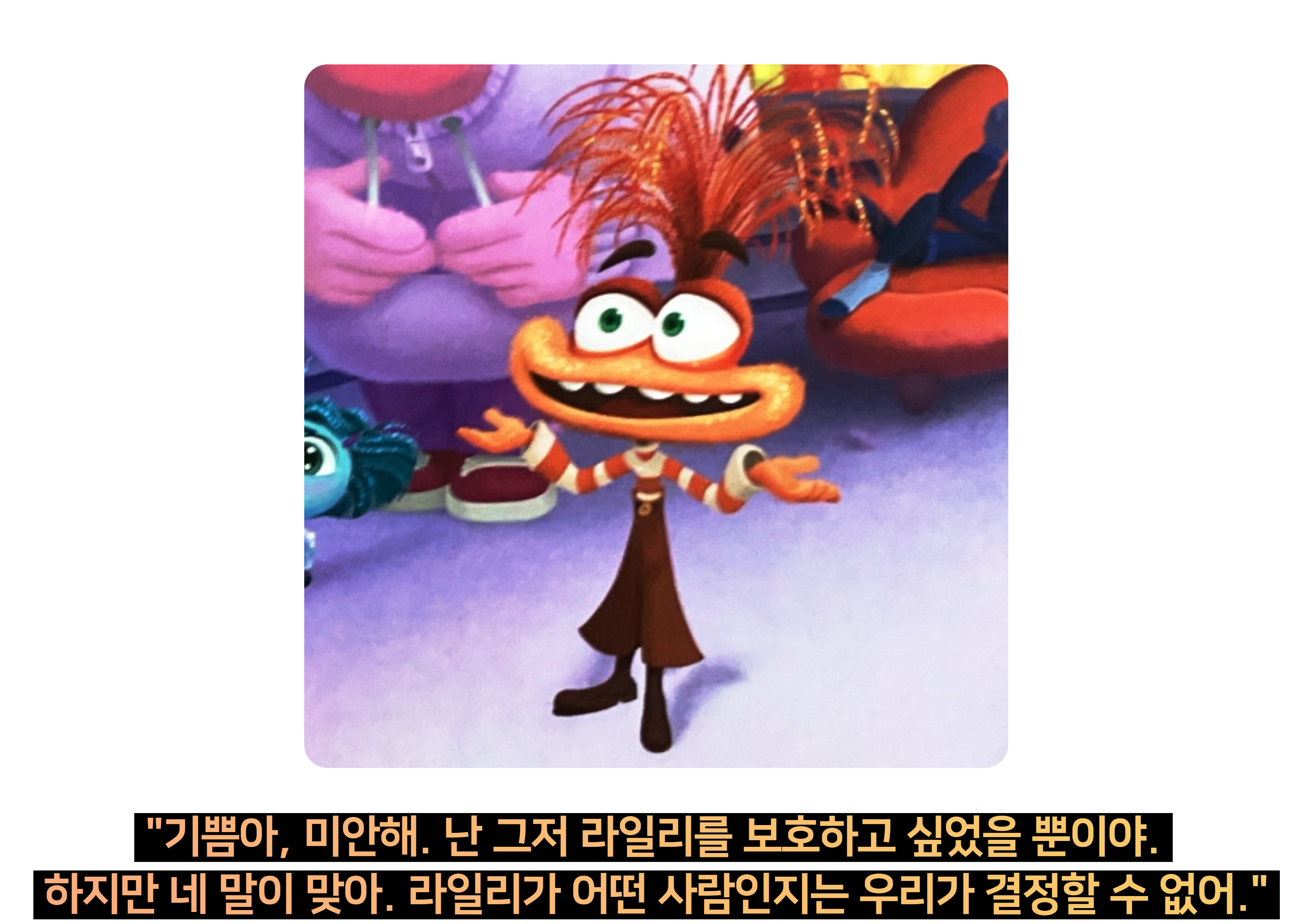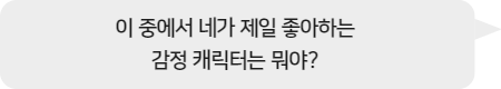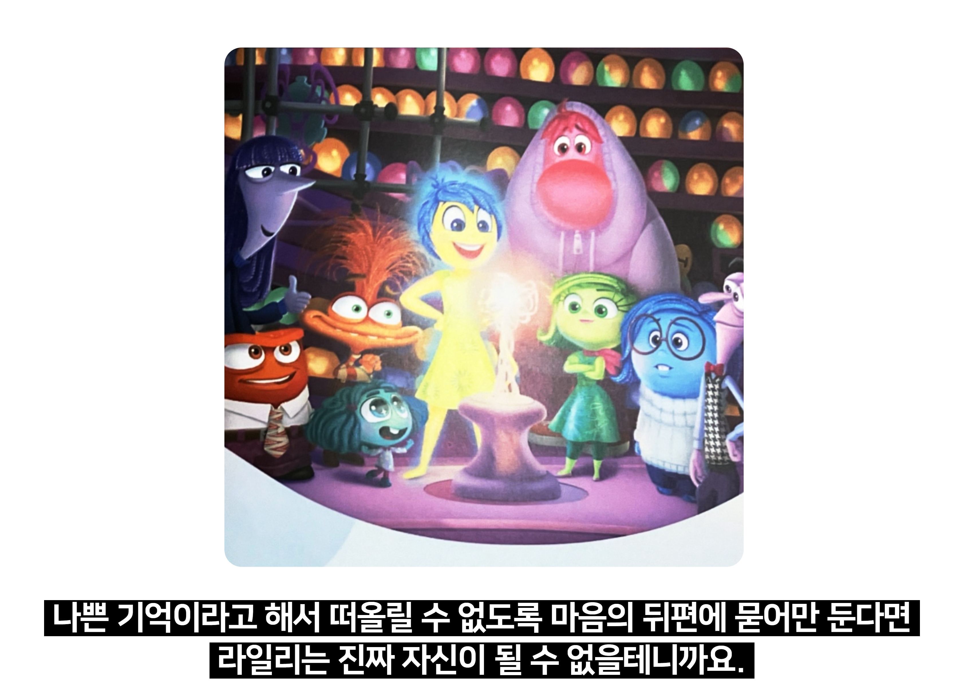 - "기쁨은 라일리를 행복하게 만들려고 노력했어요. 너희는 항상 행복해야 한다고 생각하나요, 아니면 다른 감정들도 중요한가요? 왜 그렇게 생각하나요?"