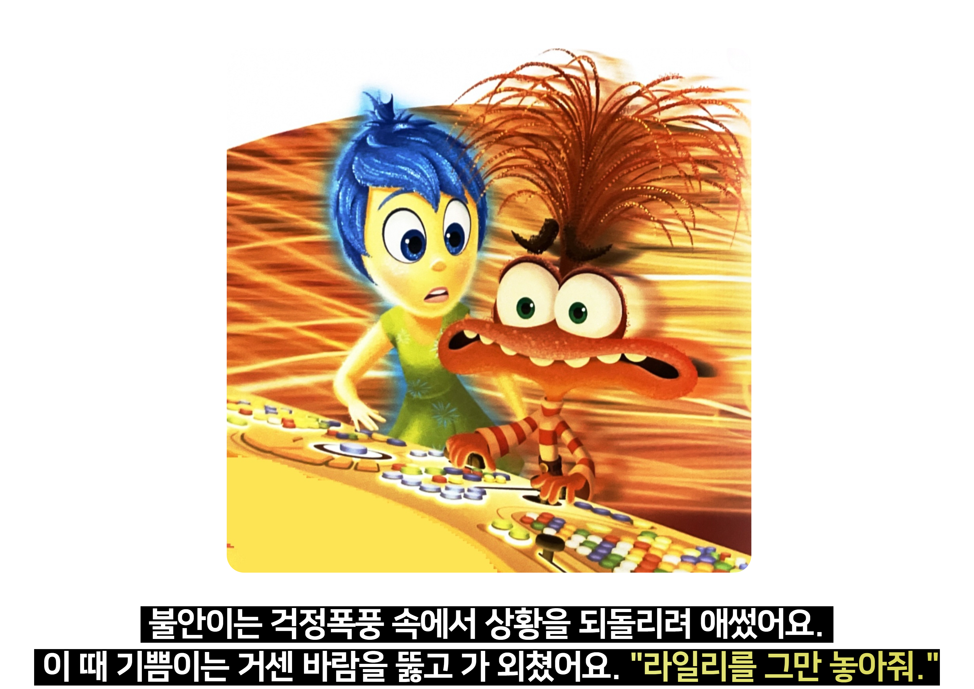 - "불안이라는 감정이 라일리를 어떻게 행동하게 만들었나요? 너희가 불안할 때는 어떤 행동을 하게 되나요?"
