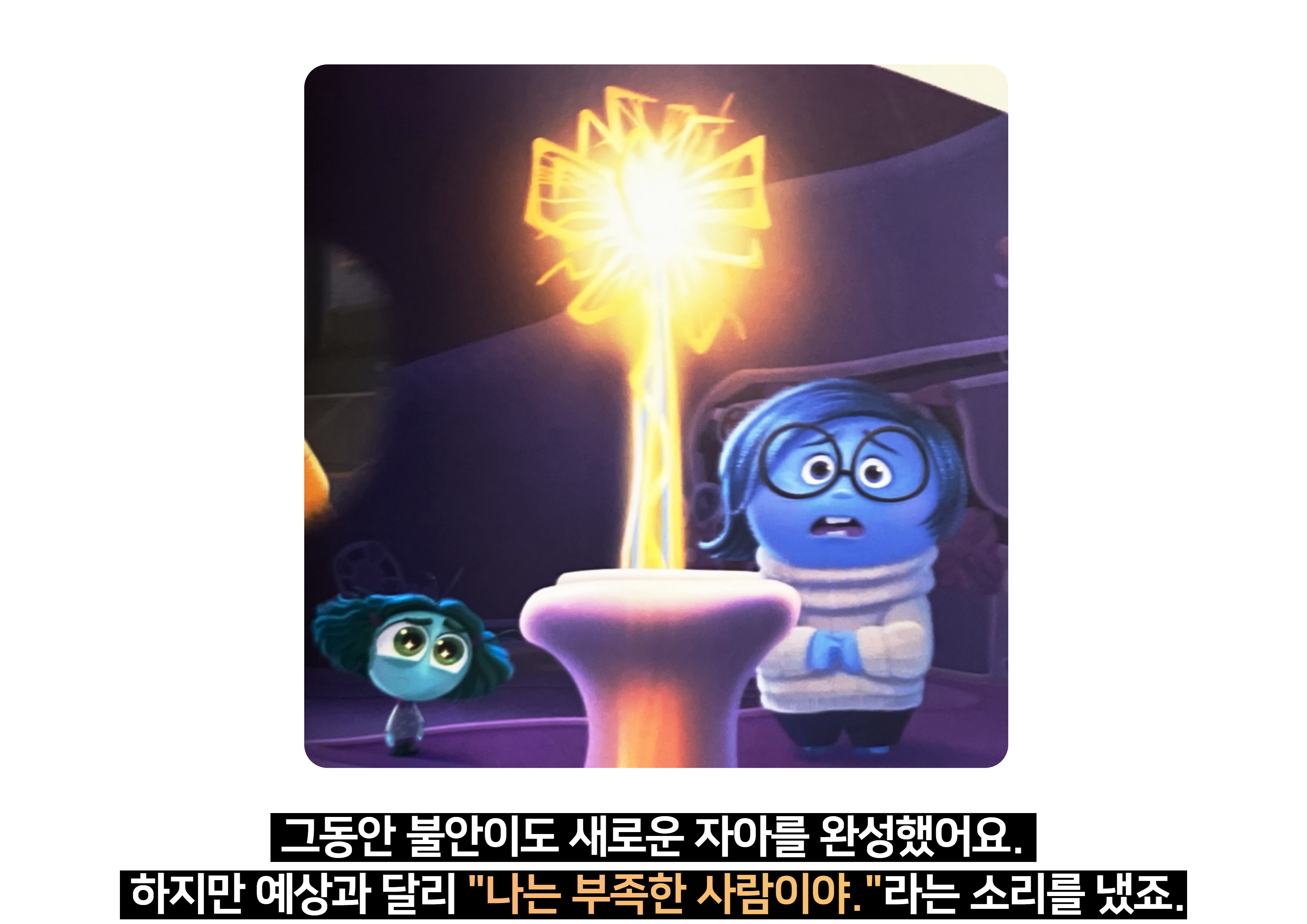 - 감정들의 대립: 불안은 라일리가 더 나은 미래를 위해 변해야 한다고 주장하며, 기존의 자아 감각을 억제하고 새로운 불안 중심의 자아를 만들려고 합니다. 기쁨과 슬픔 등 기존 감정들은 이를 막기 위해 노력하지만, 결국 불안이 주도권을 쥐게 됩니다.