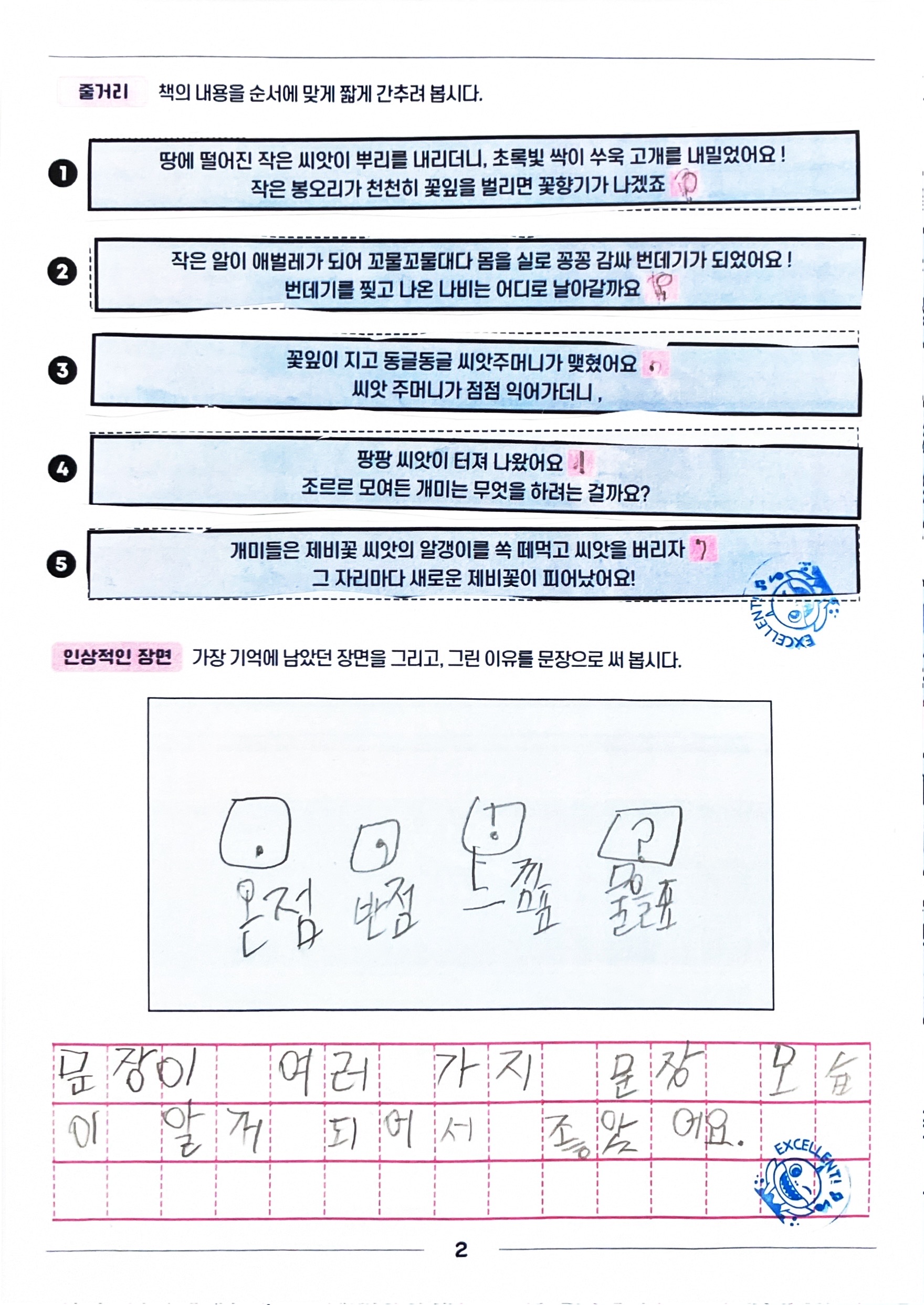 - 마침표가 사용된 부분을 찾아보고, 문장이 끝났다는 것을 학생들이 이해할 수 있도록 돕습니다. 이야기의 흐름이 멈추거나 결론이 나는 순간에 마침표가 쓰인다는 것을 설명할 수 있습니다.