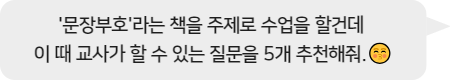 - 물음표가 사용된 장면을 보여주면서 학생들에게 해당 문장부호가 이야기 속에서 어떤 감정을 표현하는지 생각해보게 하는 질문입니다. 궁금증, 의문, 또는 놀라움을 나타낼 수 있음을 이해하도록 유도할 수 있습니다.
