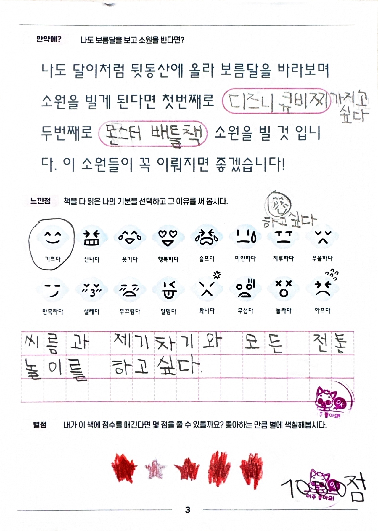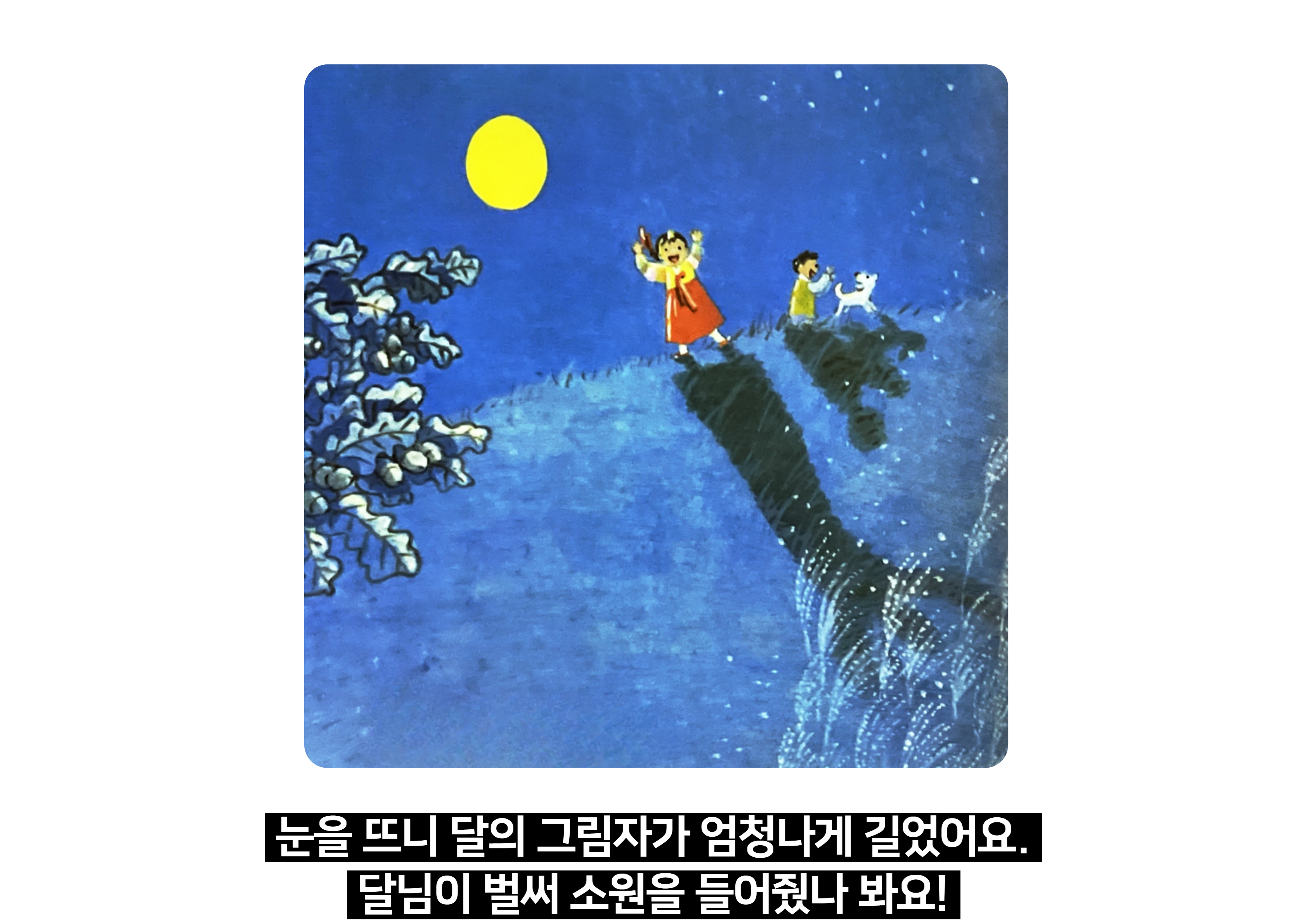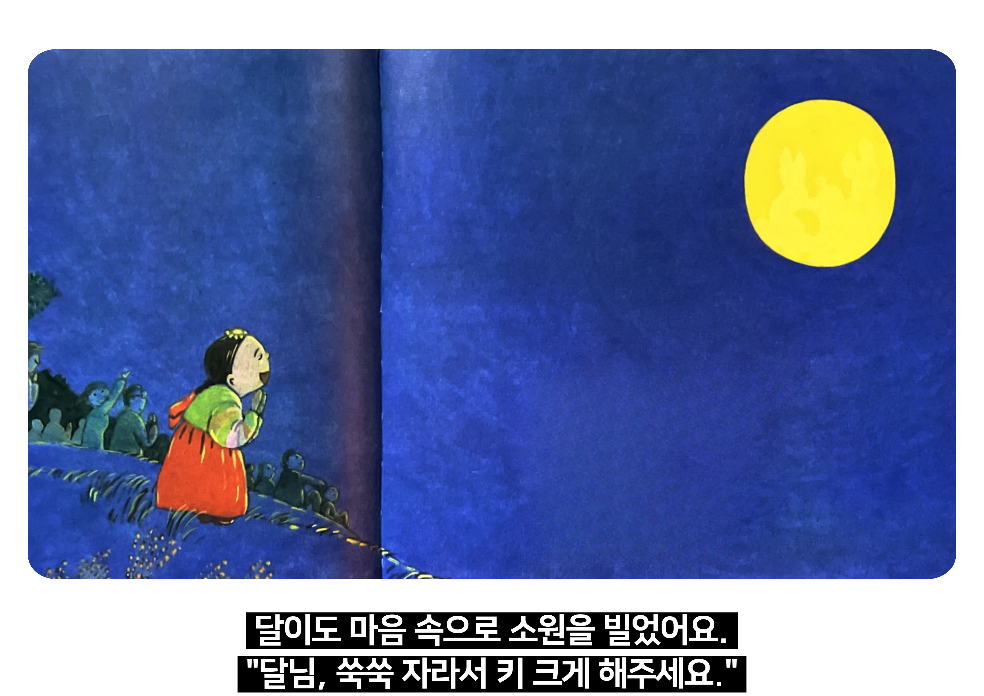 - "보름달을 보며 빌고 싶은 소원이 있다면 어떤 소원을 빌고 싶나요? 왜 그 소원이 너에게 가장 중요할까요?"