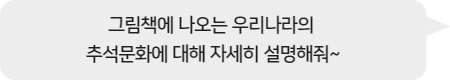 - 차례상 음식 외에도 책에서는 감, 송편, 전 등 추석을 대표하는 다양한 음식을 준비하고 나누는 장면이 나옵니다.