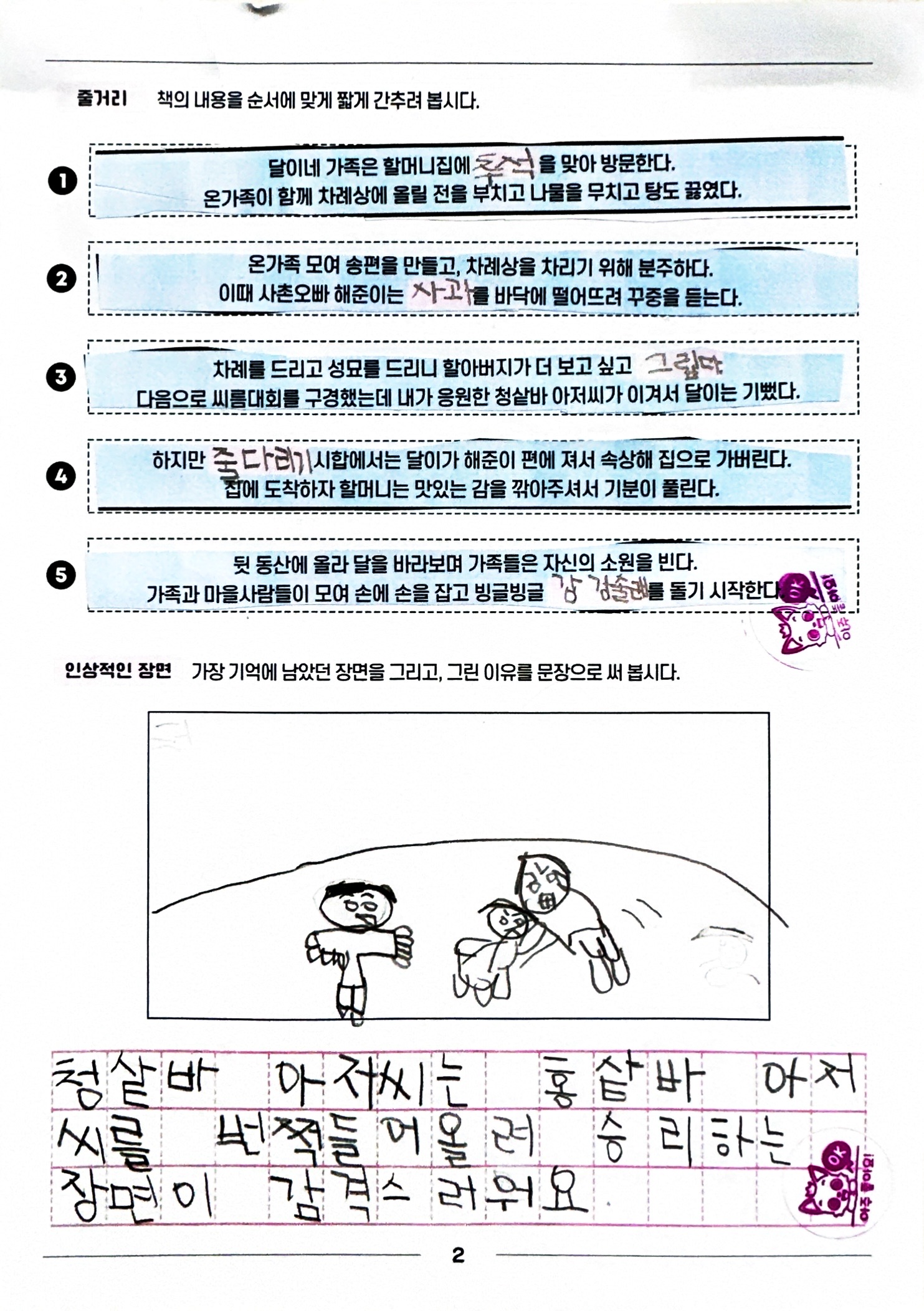 - 씨름 대회: 씨름은 추석을 대표하는 놀이 중 하나로, 책 속에서는 동네 사람들이 모여 씨름 대회를 즐기는 모습이 나옵니다.
