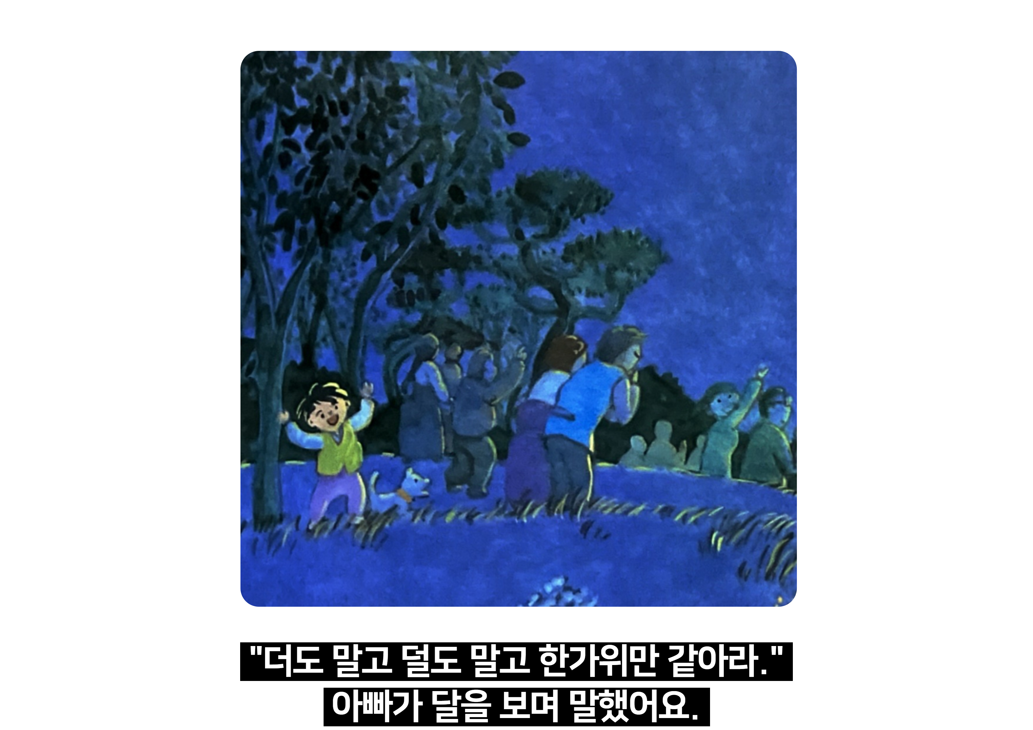 - "달이네 가족처럼 너희가 가족들과 함께 긴 시간을 보낼 수 있다면 어떤 활동을 가장 하고 싶나요? 그 이유는 무엇인가요?"