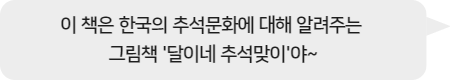 우리 날 그림책 시리즈 4권. 추석을 맞아 할머니 댁에 모인 달이네 가족에게 벌어지는 이야기를 통해 풍성하고 즐거운 추석의 모습과 풍습, 그 속에 담긴 문화를 알려 주는 문화 그림책이다.