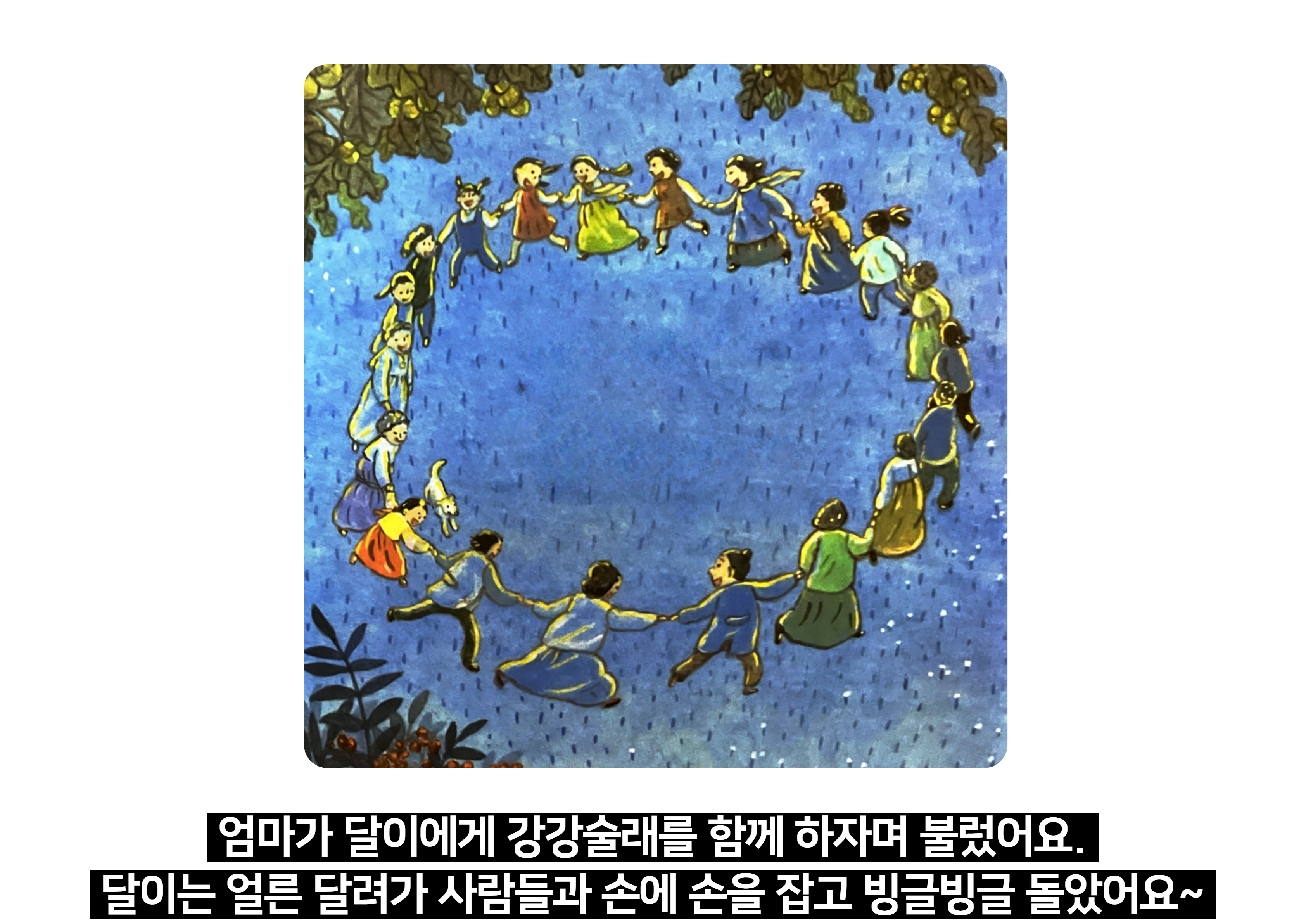 - 달밤 아래 사람들끼리 손을 잡고 강강술래를 도는 모습도 나옵니다. 이는 전통적인 여성들의 놀이로, 추석의 즐거움을 상징합니다.