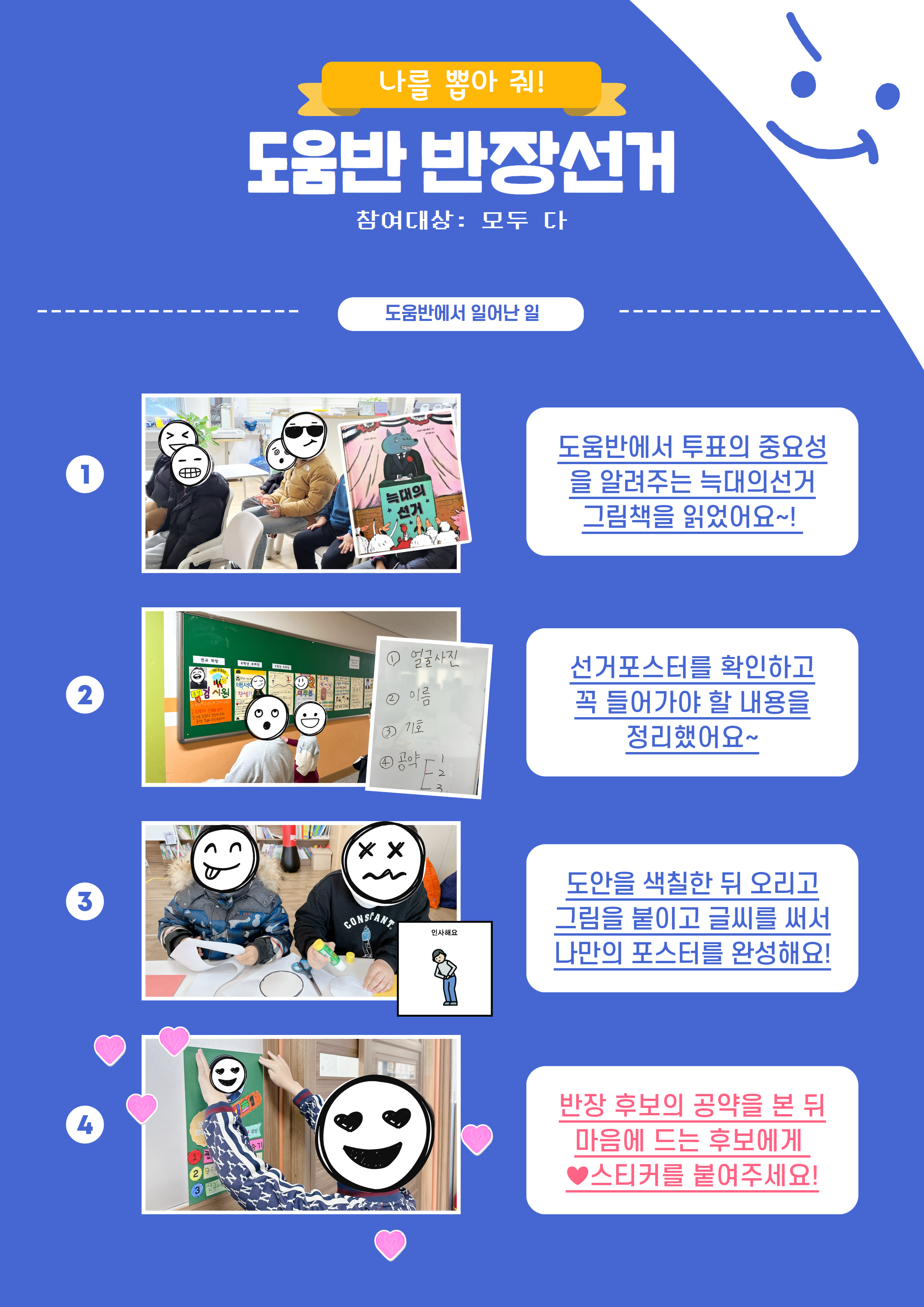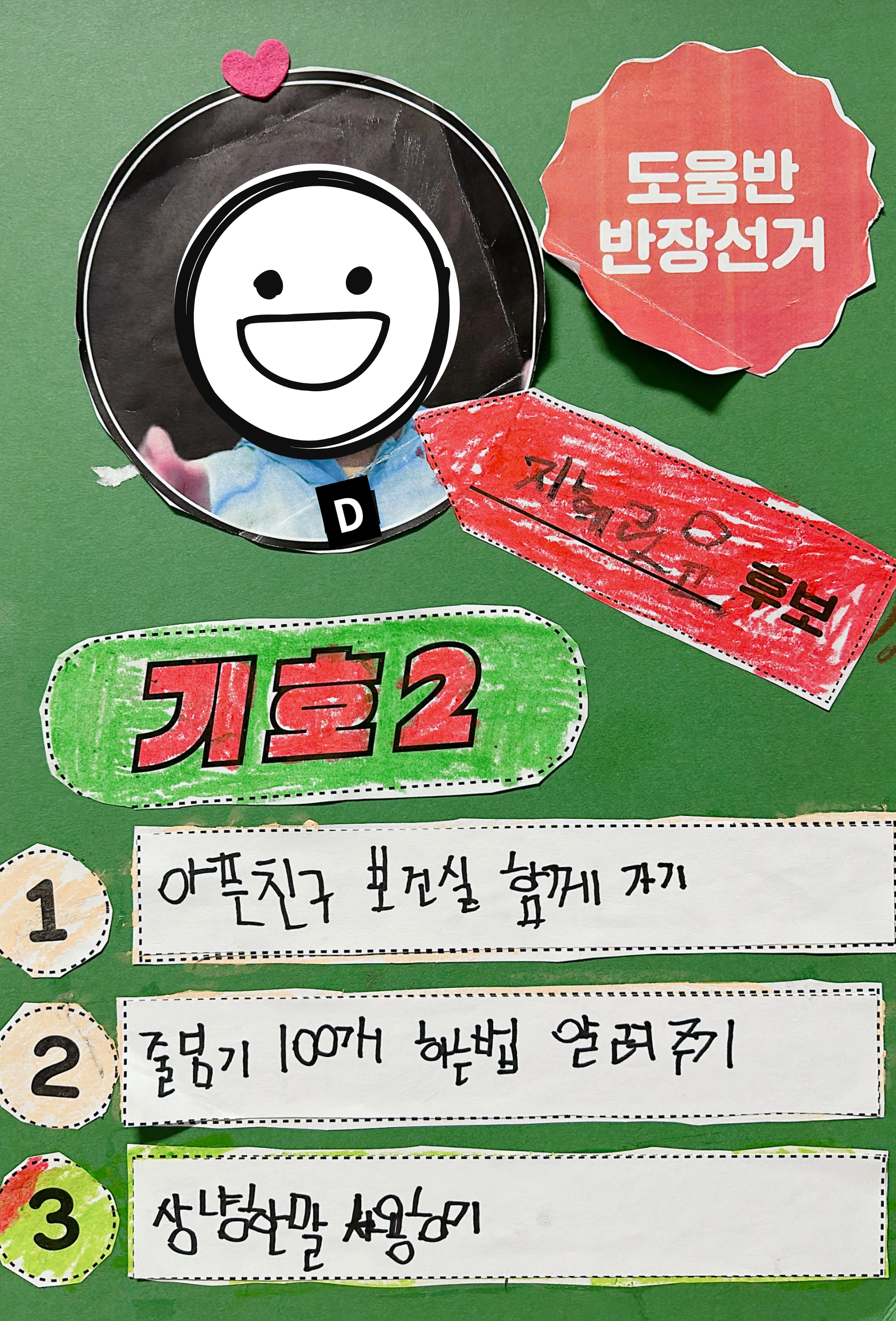 - 후보자들에게 간단하게 반장이 되면 하고 싶은 일을 생각하게 해요.