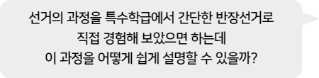 - 핵심 메시지: "우리는 반을 이끌어 줄 사람을 뽑기 위해 투표를 해요. 이 과정이 바로 '선거'예요."