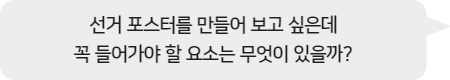 - 포스터에서 가장 눈에 띄게 후보자의 이름과 사진(또는 그림)을 넣어요.