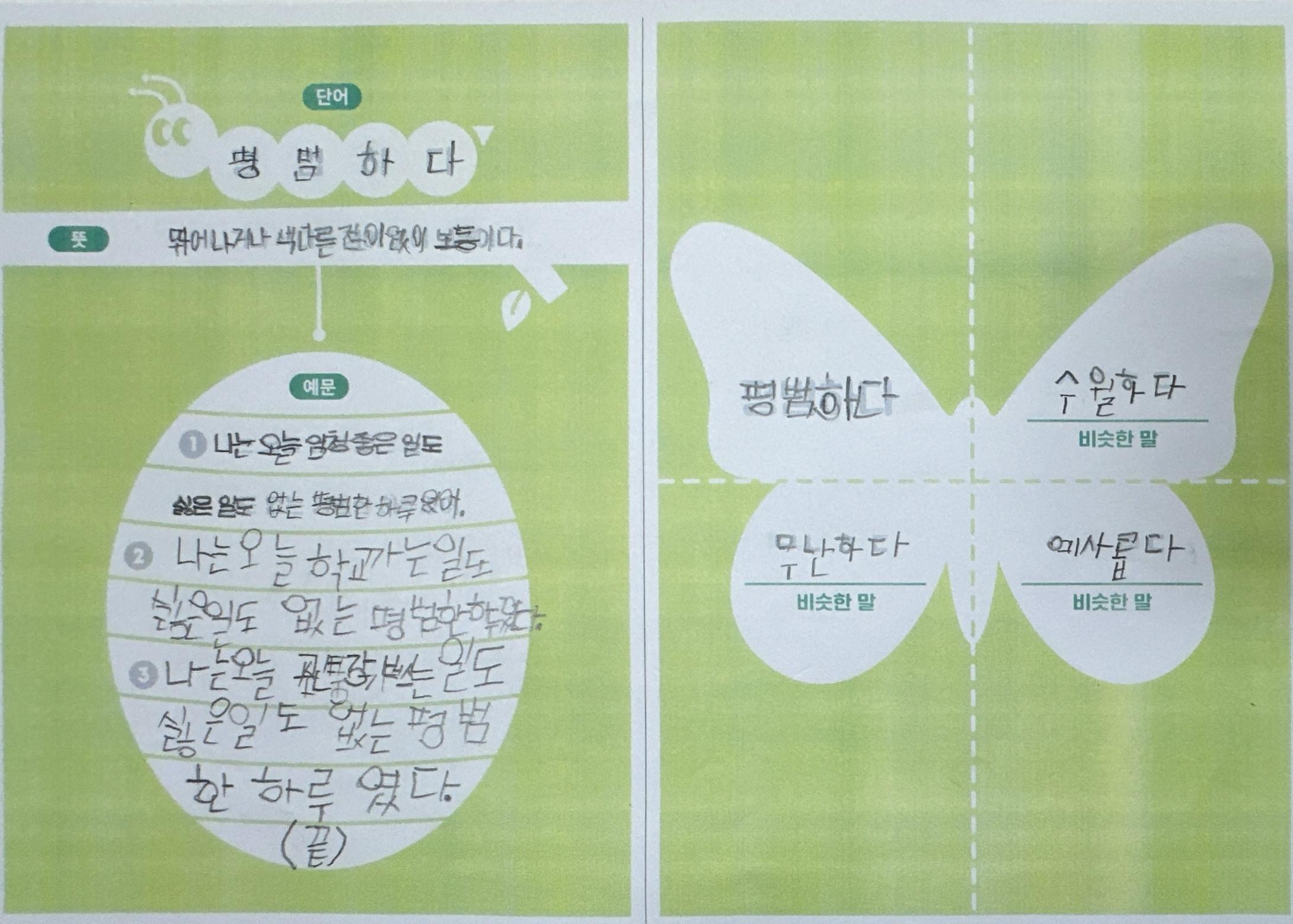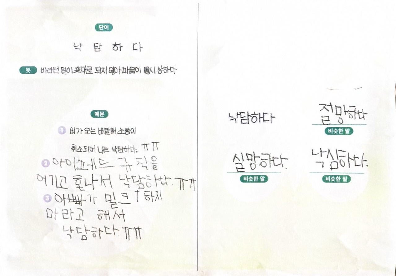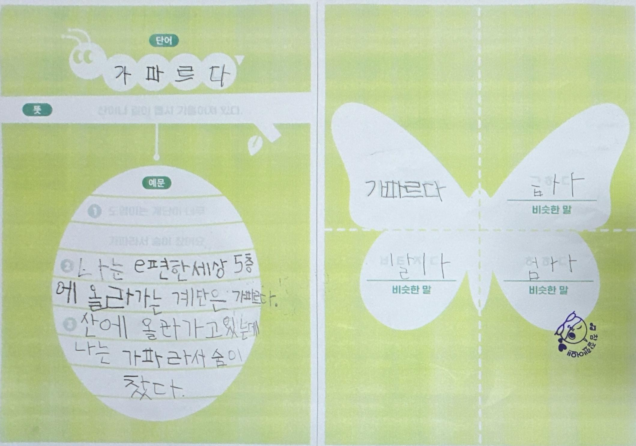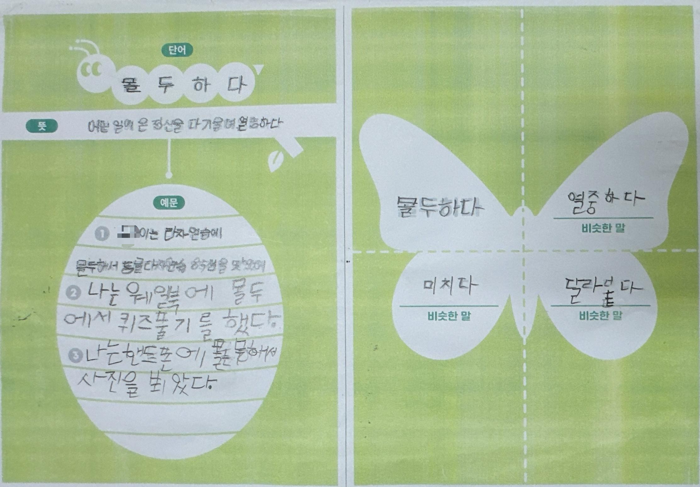 1) 애벌레 단계: 목표단어와 뜻을 한 번 더 읽어보고 따라 쓴다.