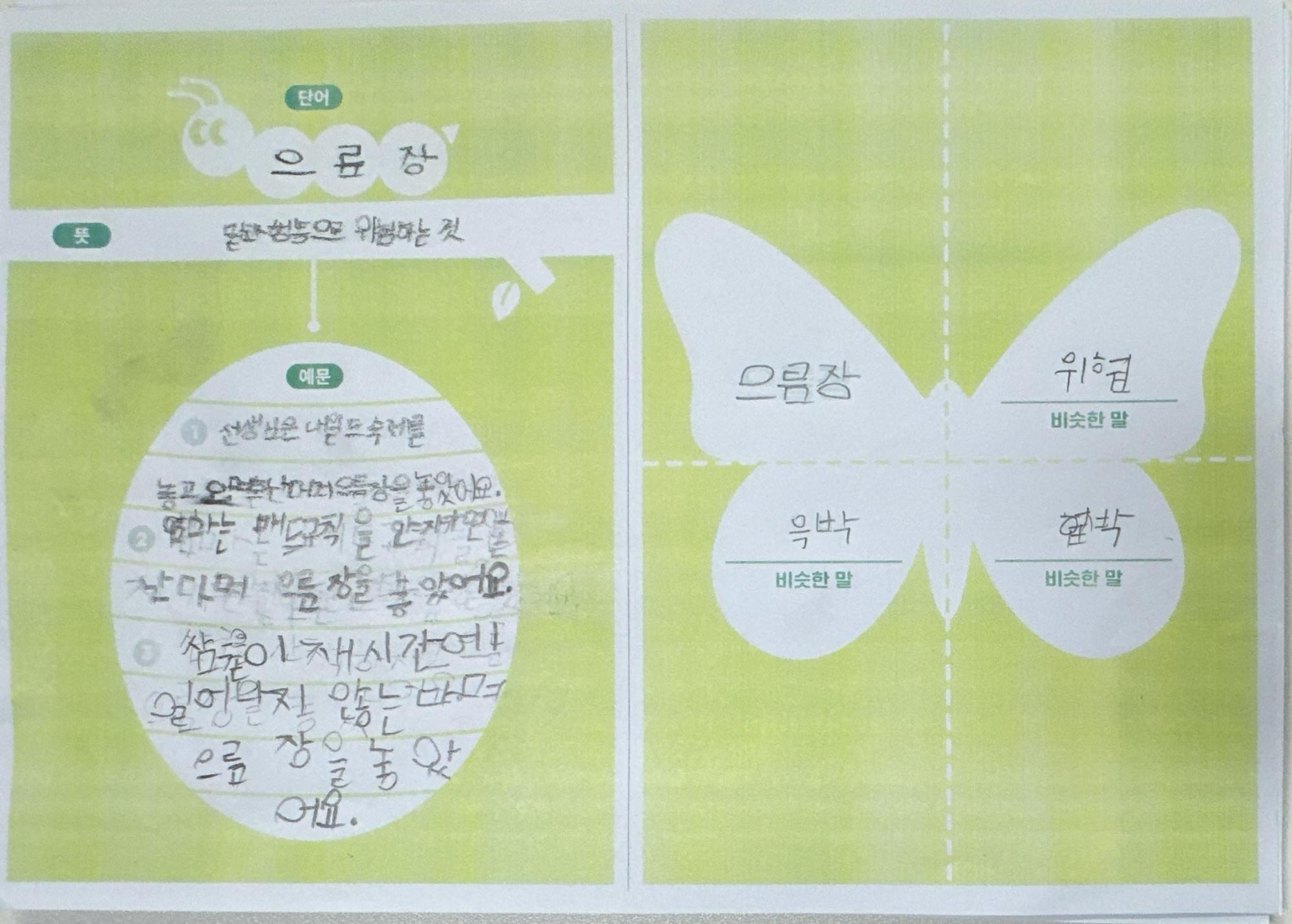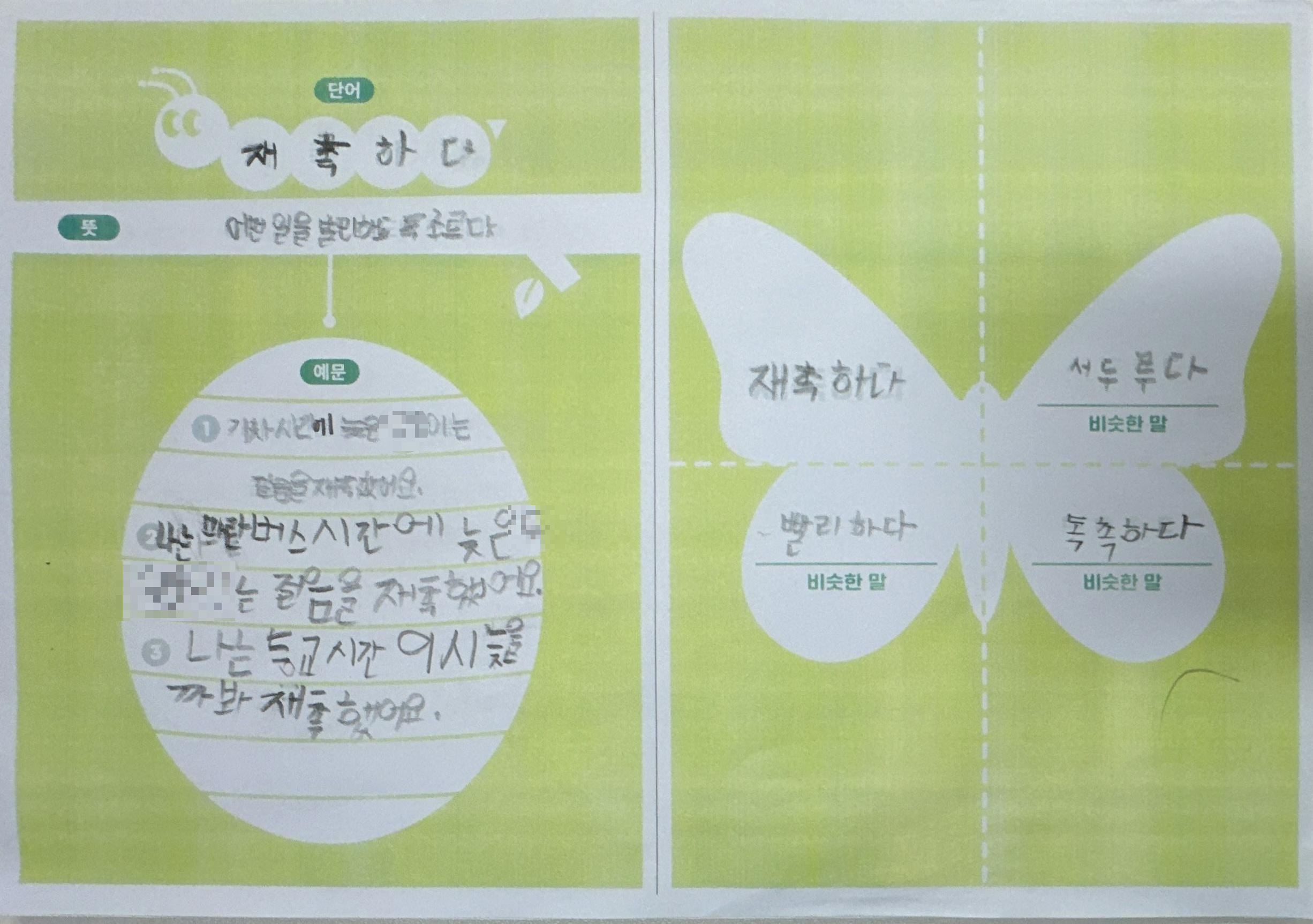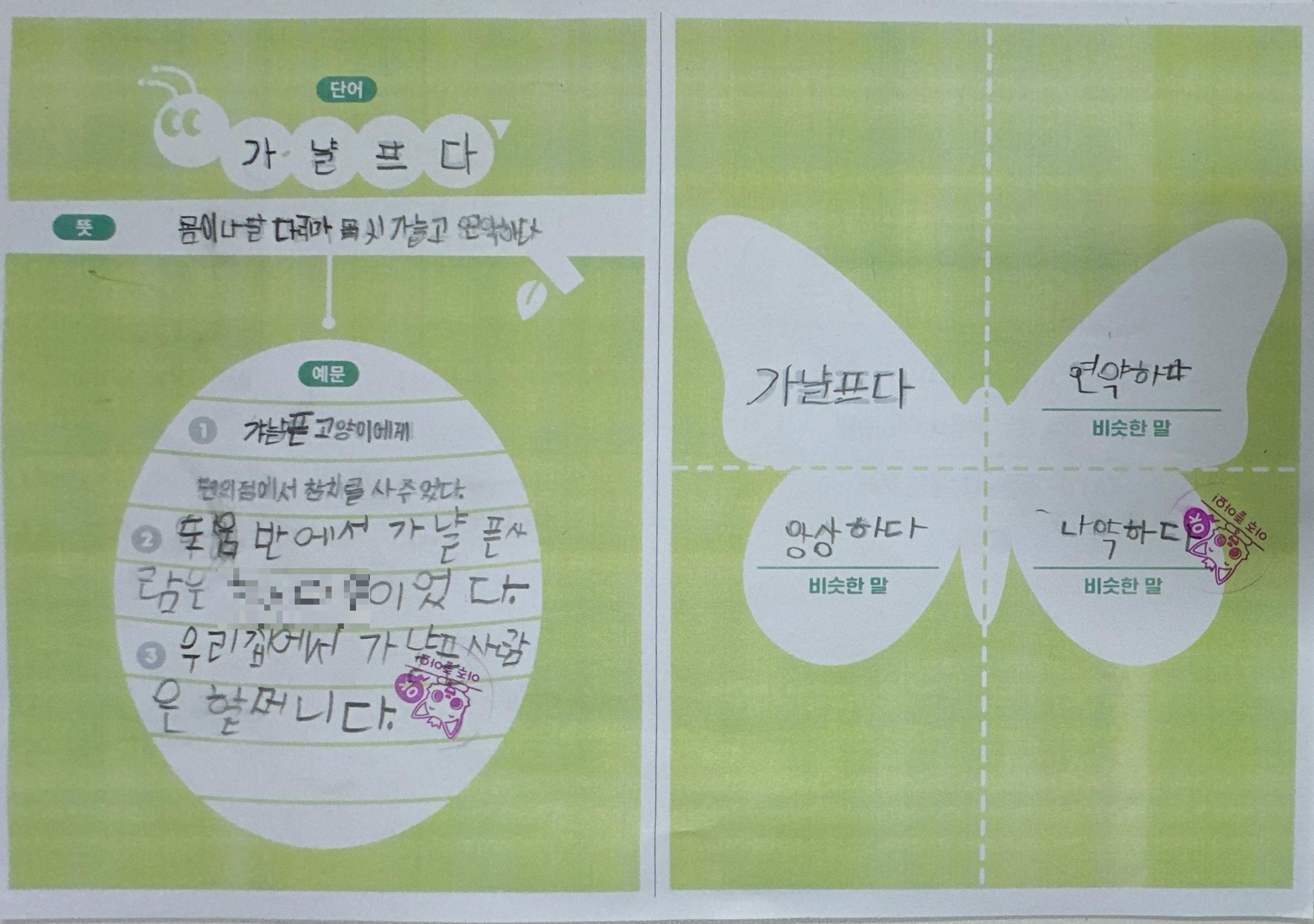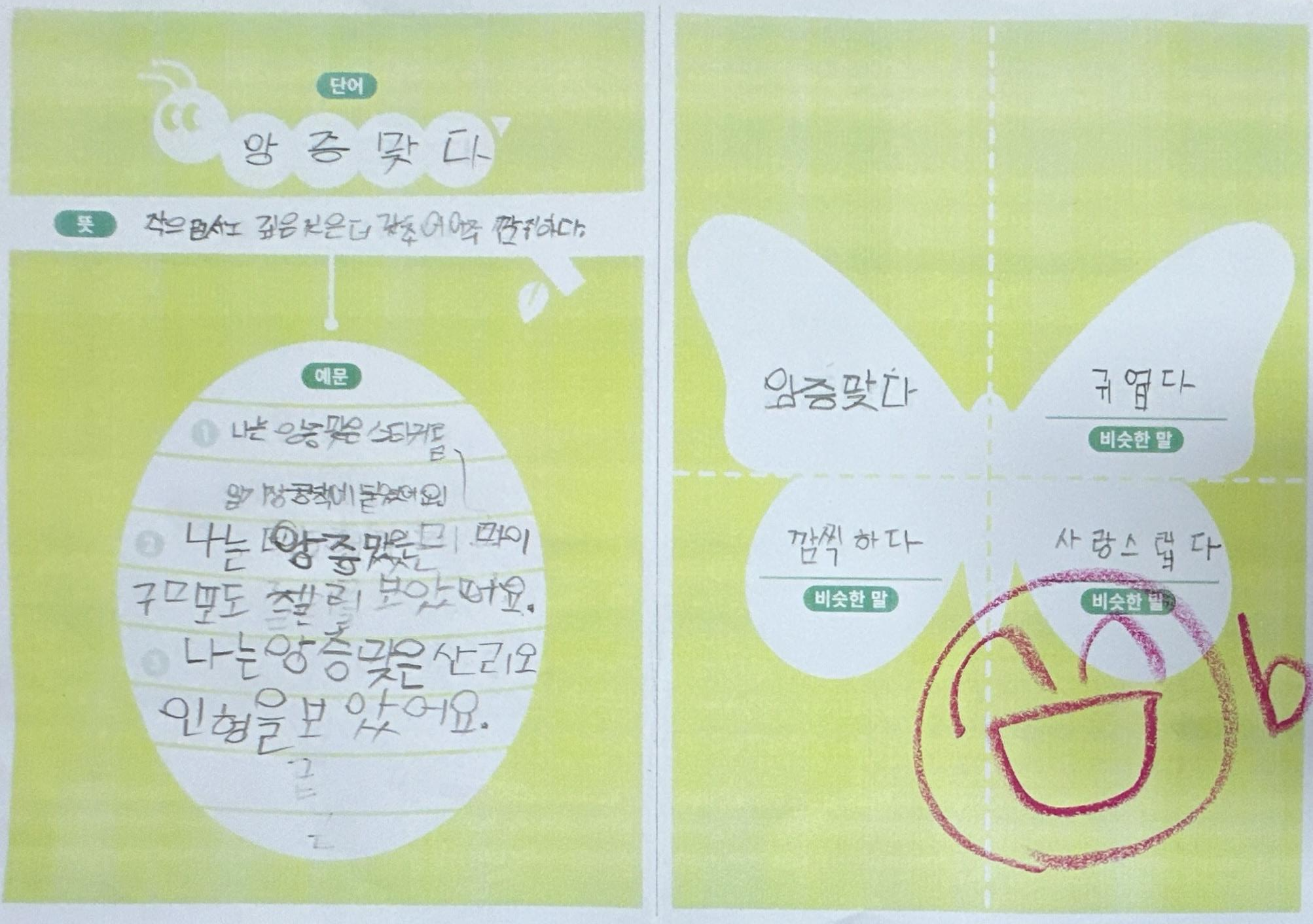 1) 애벌레 단계: 목표단어와 뜻을 한 번 더 읽어보고 따라 쓴다.
