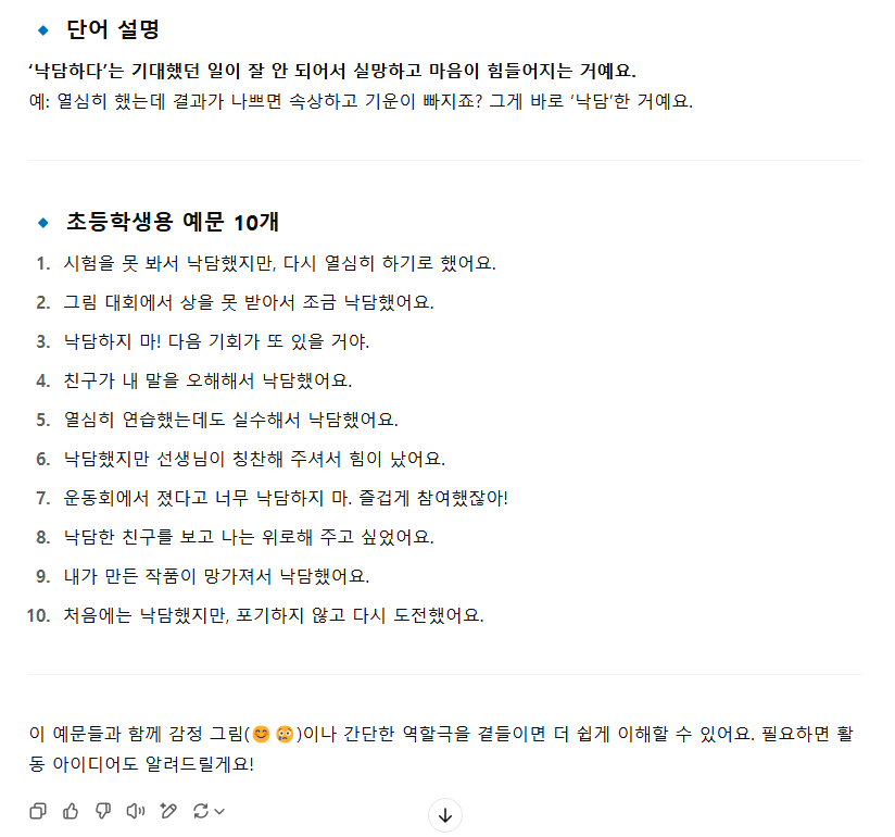 낙담했지만 선생님이 칭찬해 주셔서 힘이 났어요 -> 낙담했지만 엄마가 칭찬해 주셔서 힘이 났어요