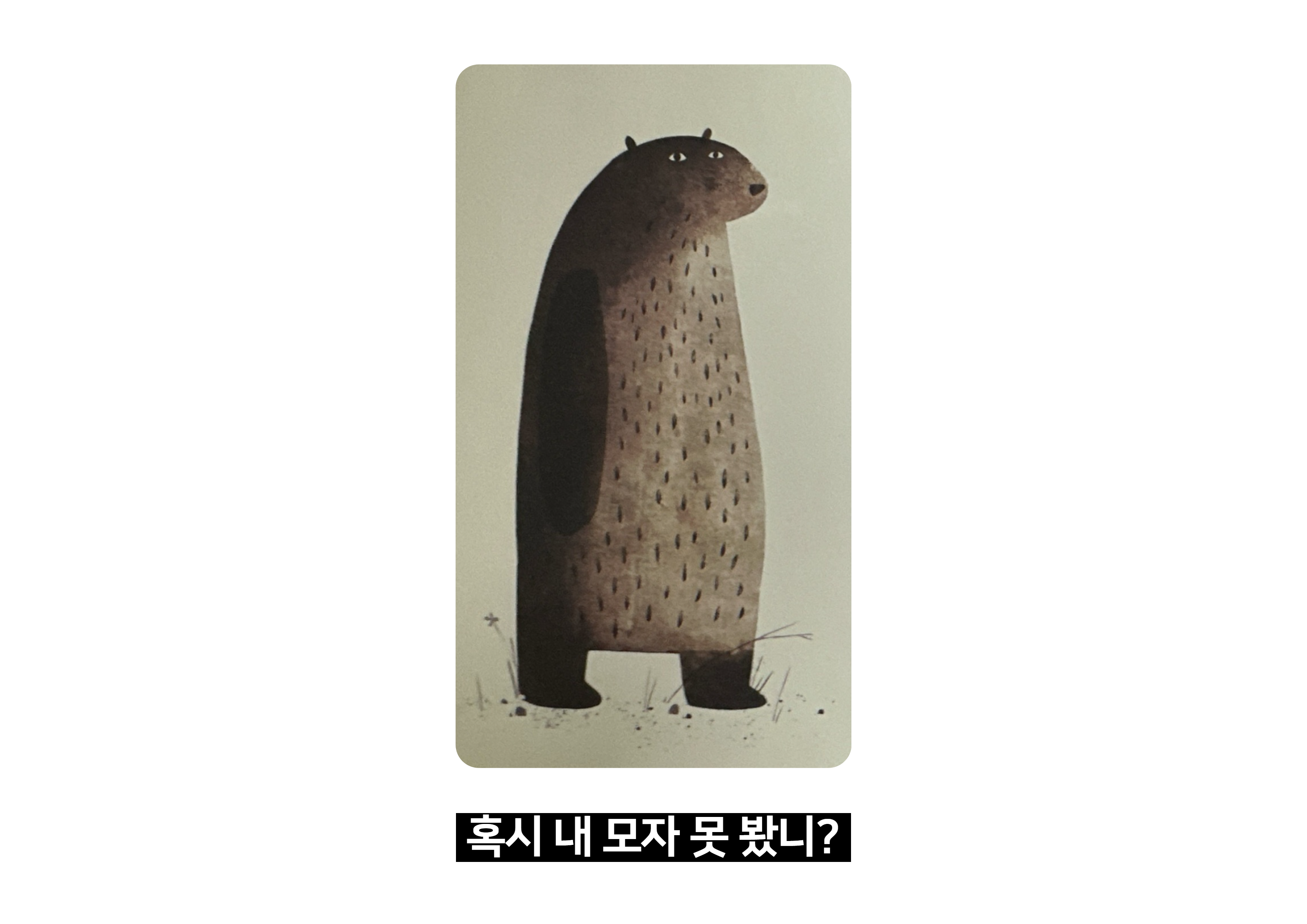 순서동물특징 / 행동1 곰 이야기의 주인공. 자신의 모자를 잃어버려 여러 동물에게 물어봄. 결말부에서 모자를 되찾음. 2 거북 바위 위에 올라 있음. 곰의 질문을 받는 첫 번째 동물. 3 여우 동물 대열의 두 번째. 모자에 대한 질문을 받음. 4 뱀 길게 뻗어 있음. 질문을 받음. 5 두더지(혹은 두더지 비슷한 굴속 동물) 땅 위에 반쯤 나온 모습. 질문을 받음. 6 사슴 기다란 뿔이 있는 동물. 질문을 받음. 7 토끼 빨간 삼각형 모자를 쓰고 있음. 곰의 모자를 훔친 동물. 모자를 쓰고 시치미를 뗌. 8 다람쥐 후반부에 등장. 곰에게 모자 쓴 토끼를 보았냐고 묻는 장면이 인상적. 즉, 곰과 상호작용하는 주요 동물은 총 8마리이며, 이 중 곰과 토끼가 사건의 핵심 인물입니다.