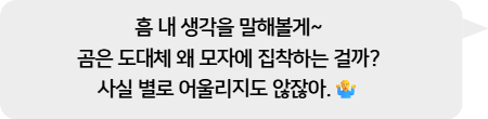 - 자기 표현: 비록 다른 사람 눈에는 안 어울려도, 곰 자신은 그 모자를 쓰는 모습이 마음에 들었을 수 있음