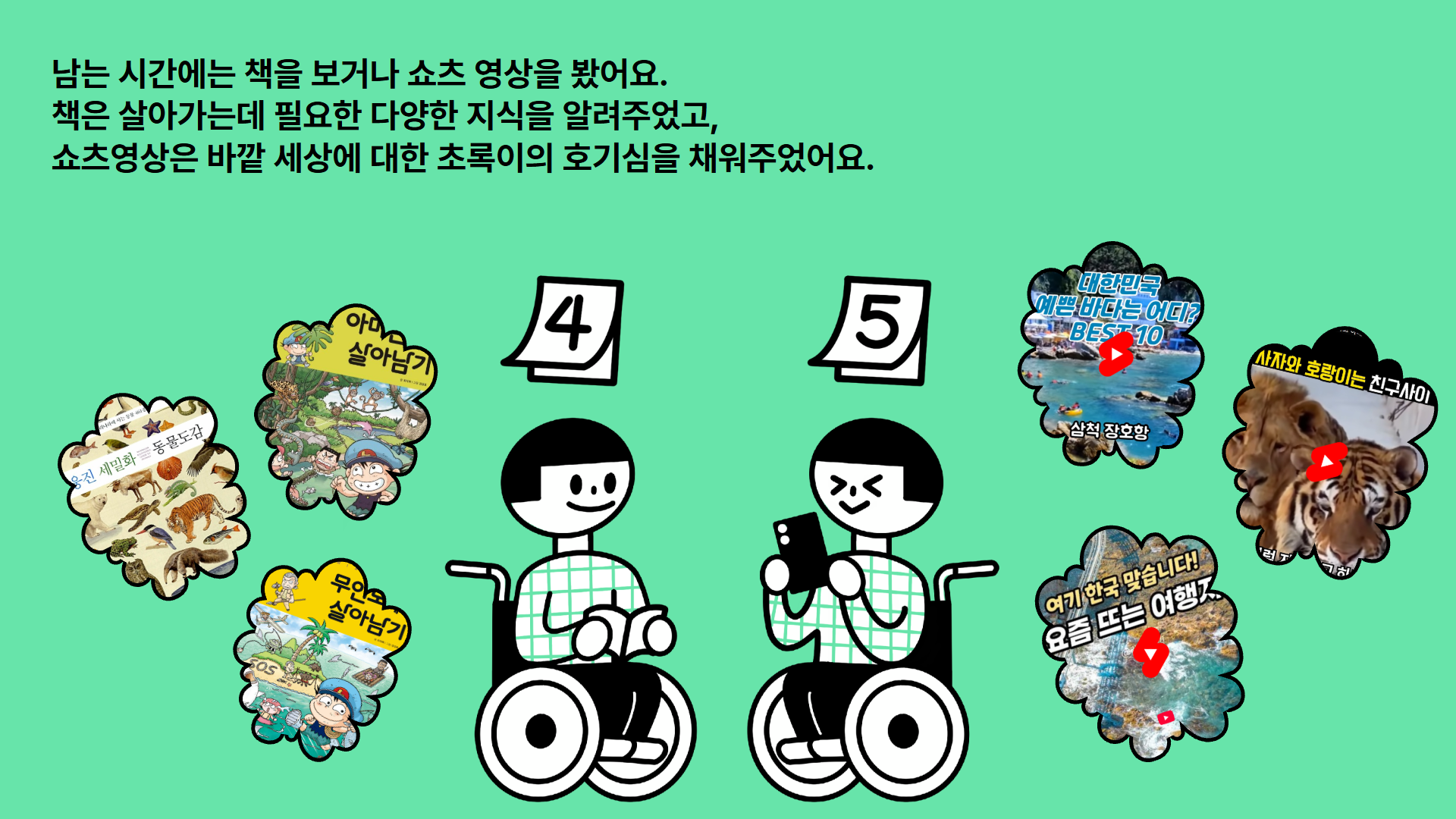- 쇼츠를 좋아하는 초록이의 설정은 H, 집에서 밥먹고 숙제한 다음에 태블릿으로 유튜브 영상을 몇 시간(?) 동안 본다고 한다.