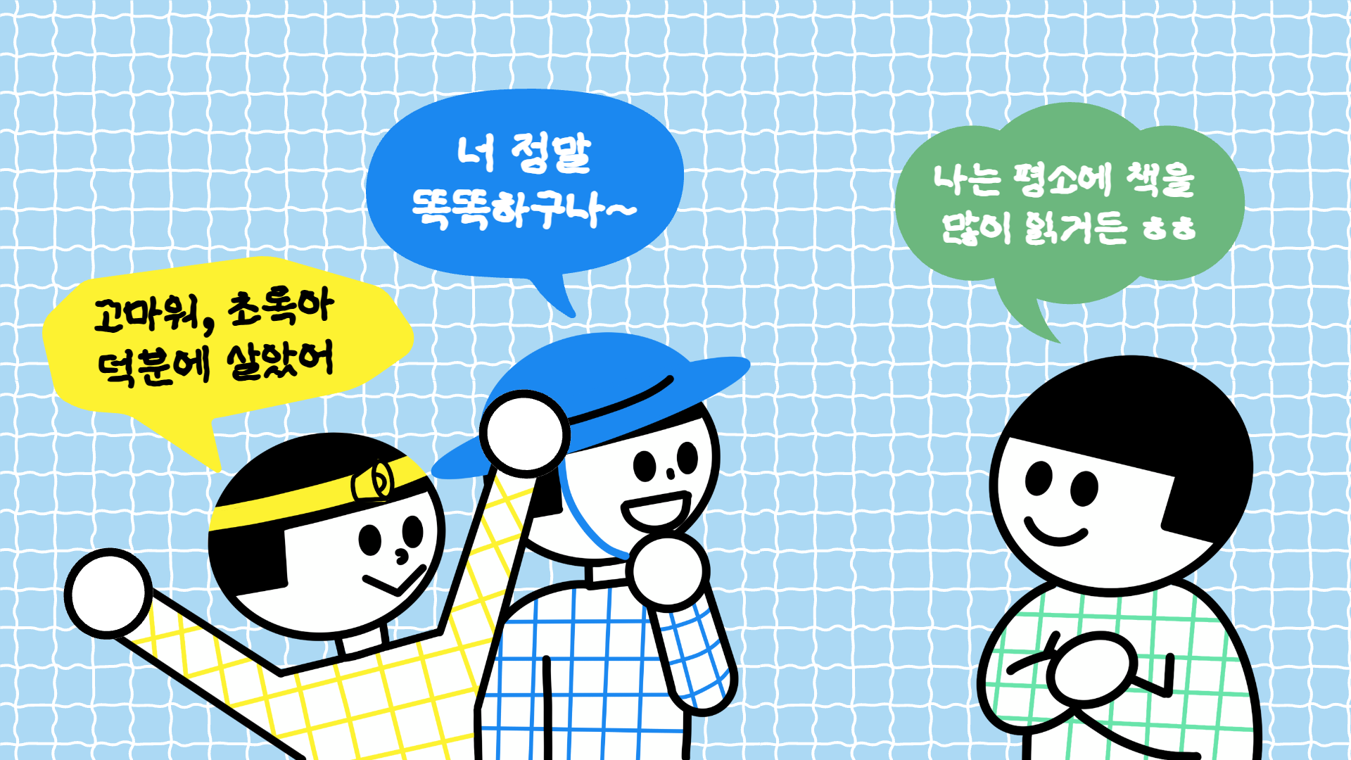 - 초록이가 관찰하기를 좋아하는 설정은 행동분석. 학생의 이해할 수 없는 행동을 긴 시간을 살펴보고 기록하는 모습이 담겨있다.