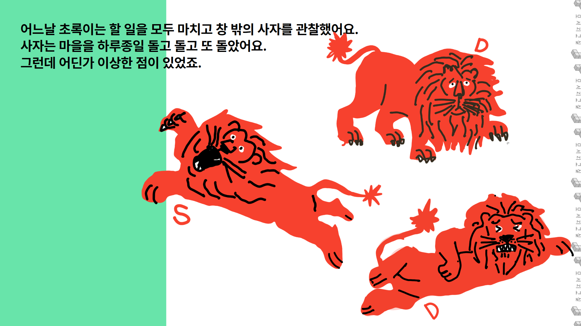 - 뭐 출판한 책은 아니지만, 그림책을 만들어보니.. 글을 최소화하고 그림으로 전달하려는 의미를 대부분을 표현한 작가님들이 대단해 보인다. 난 글을 너무 많이 쓴 거 같다.