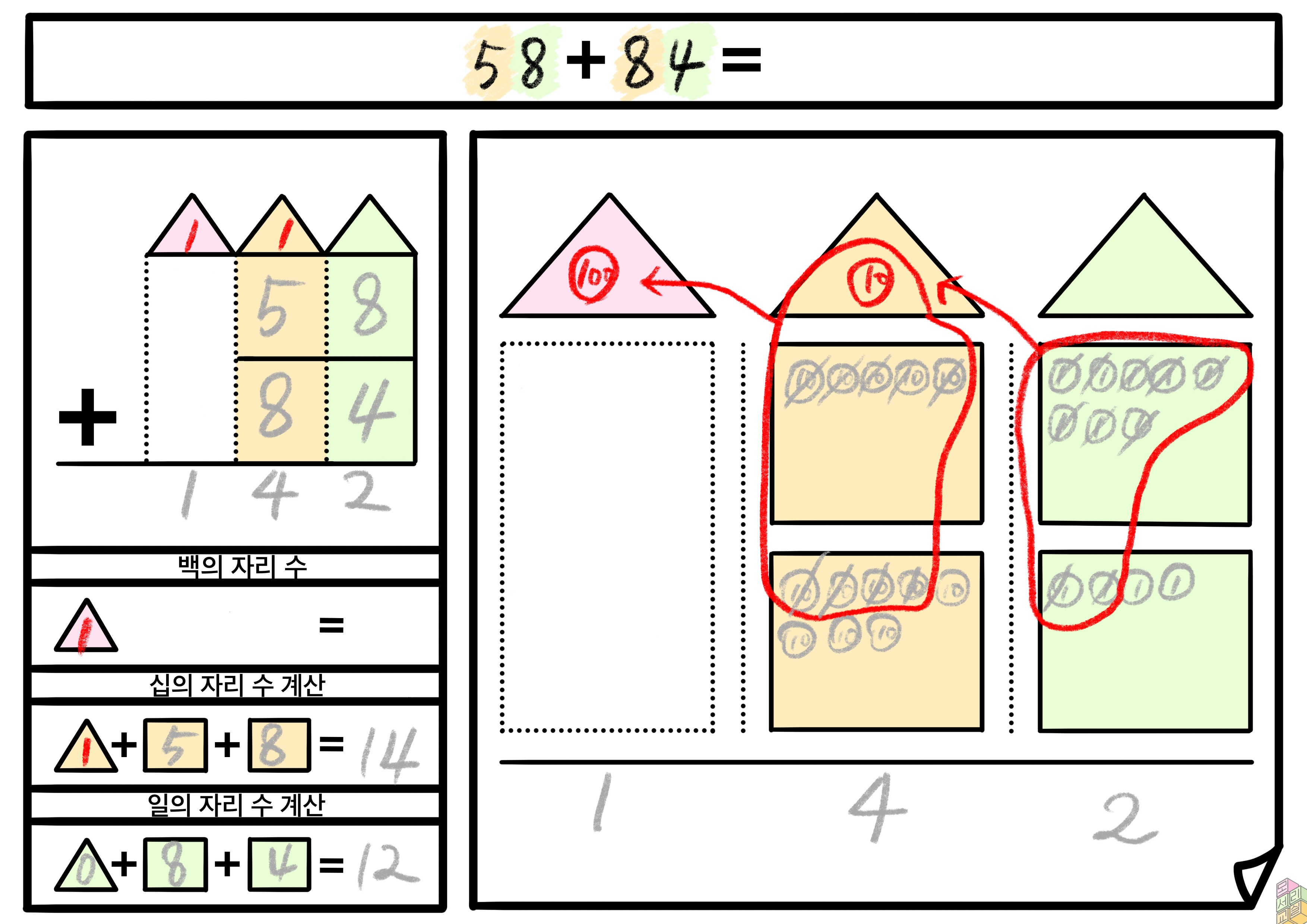 수학을 가르치다 보면 중간중간 계단 턱처럼 고비가 있는데, 그 중 하나가 받아올림, 받아내림이라고 생각한다. 효율적이고 빠른 연산을 위해서는 받아올림이 꼭 필요한데, 아이들에게는 크게 와닿지 않는 듯하다...